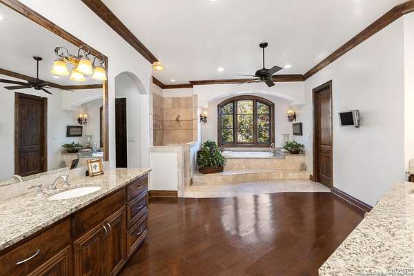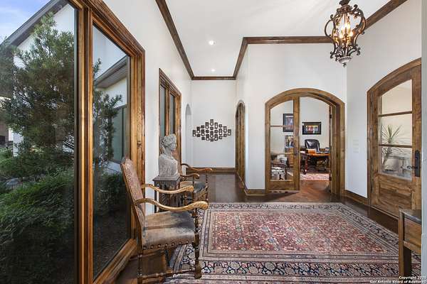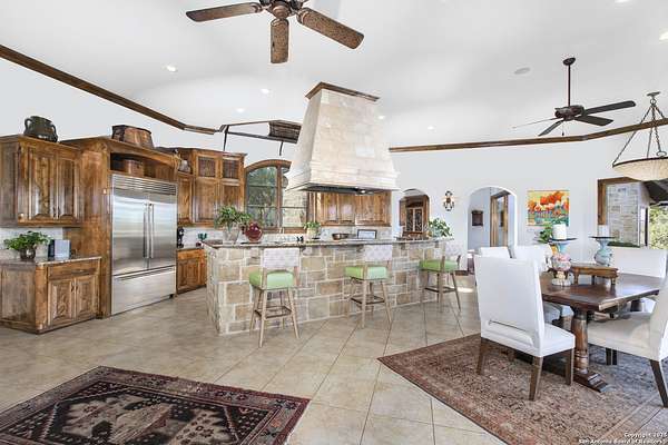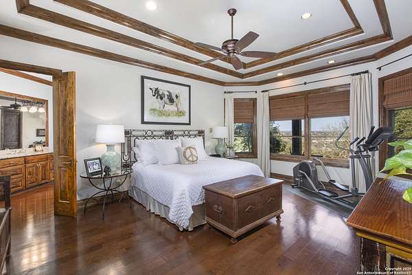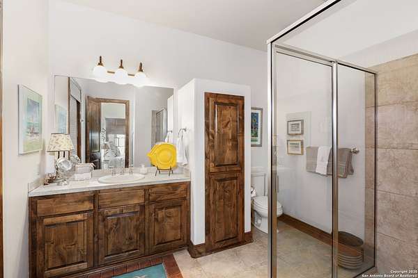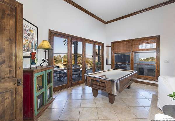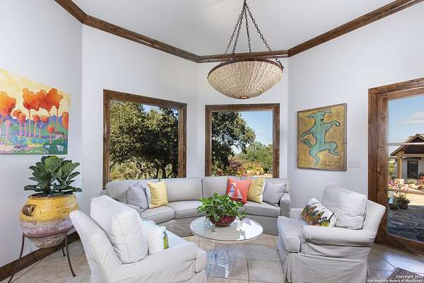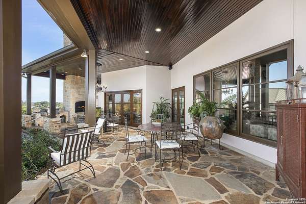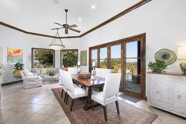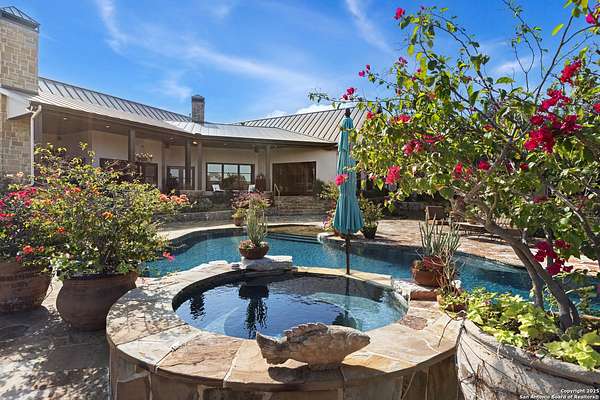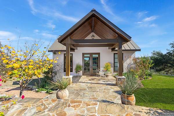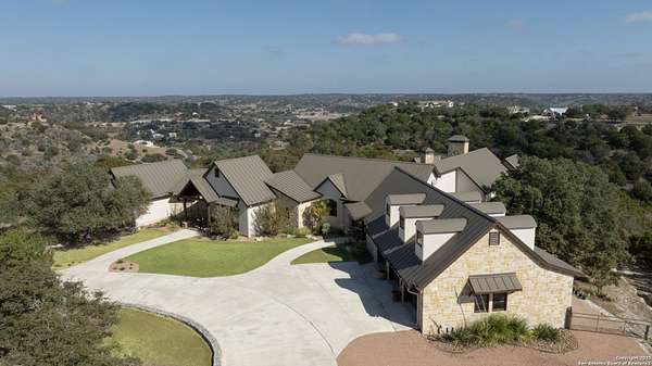 165 Painted Sky is an Incredible Hill Country Custom Home with jaw dropping views from every window located in The Reserve at Falling Water, an exclusive private gated neighborhood between Comfort and Fredericksburg. This majestic home features a massive outdoor entertaining area overlooking 12+ acres with panoramic views in every direction. You'll enjoy the refreshing beach entry pool and hot tub, deep covered gallery porches and stone decking for entertaining, The home offers 4 Bedrooms in the Main Dwelling with an additional one bedroom Casita. The Casita is fully functional w/Kitchen, Living Area, Separate Bed & Bath + laundry. The custom Home was built by Buffalo Homes featuring detailed finishes such as Masonry fireplaces, wood & tile floors, soaring ceilings, abundant stonework, solid wood doors and countless other custom detailing. Built for entertaining in the classic Hill Country style, the Great Room & Dining area are some of the perfect areas for gatherings. The chef-inspired Kitchen is open w/custom granite countertops, gorgeous views, plentiful cabinets, stone-clad center island & high end appliances such as Subzero and Wolf. The commanding Primary Bedroom suite is a spacious restful retreat w/fireplace and doors opening to a covered patio to enjoy the views. The luxe spa-inspired bath offers dual sinks overlooking the views, soak tub and expansive closets w/built-ins. 3 additional comfortable bedrooms round out the Main House. You'll have plenty of room to hike and explore this estate w/trails and spectacular view vantage points. The neighborhood offers a Wildlife Exemption and a community water system that is conveniently located w/close proximity to world famous Fredericksburg, Boerne and Comfort. This timeless Hill Country Estate is the epitome of luxury living.
