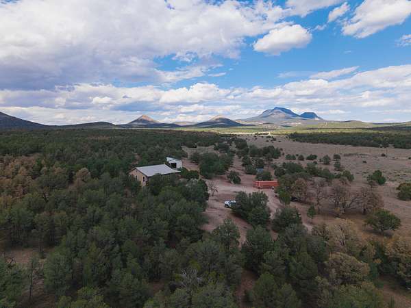 Sojourn Valley Ranch consists of +-604 deeded acres split by Reid Road. The north side includes +-100 acres with a custom home, shop, and Quonset, while the remaining +-504 acres lie directly south in open pasture with corrals and RV hookups. A 640-acre State Land lease adjoins the western boundary of the southern parcel, expanding grazing and wildlife habitat. Elevations run from 7,400 to 8,000 feet, with gently rolling prairie broken by draws, seasonal arroyos and thick stands of trees. Vegetation ranges from blue grama and Arizona fescue grasslands to pinon-juniper, ponderosa, and scattered alligator juniper. Views are framed by prominent peaks on all sides, including Mangas Mountain to the southwest, Alegres Mountain to the east, Escondido Mountain to the west, and the Datil Mountains to the northeast, giving the ranch a dramatic mountain backdrop.