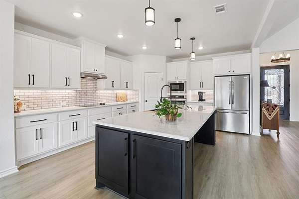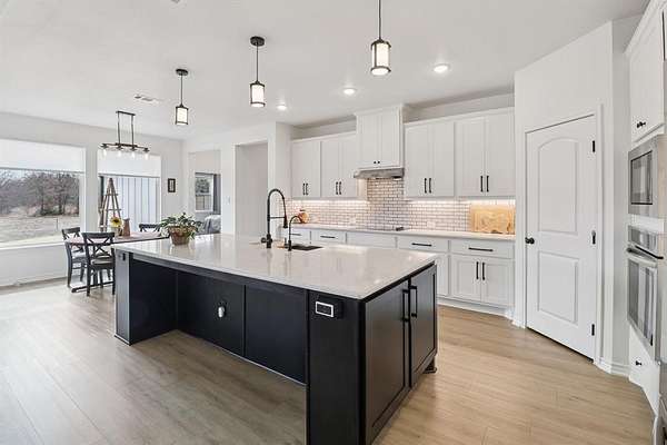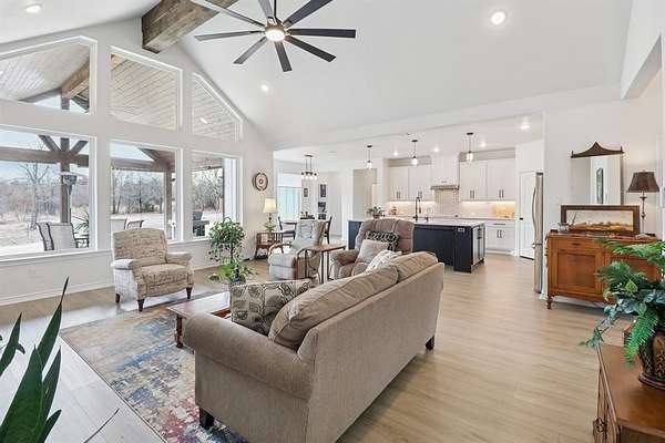 Built in 2023, this 2,689 square foot home features an open concept family room with soaring vaulted ceilings, rustic wood beams, and expansive windows showcasing beautiful nature views. The gourmet kitchen includes quartz countertops, stainless steel appliances, a large pantry, and custom cabinetry with soft close hinges. Luxury vinyl plank flooring runs throughout most of the home.