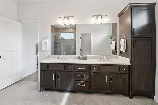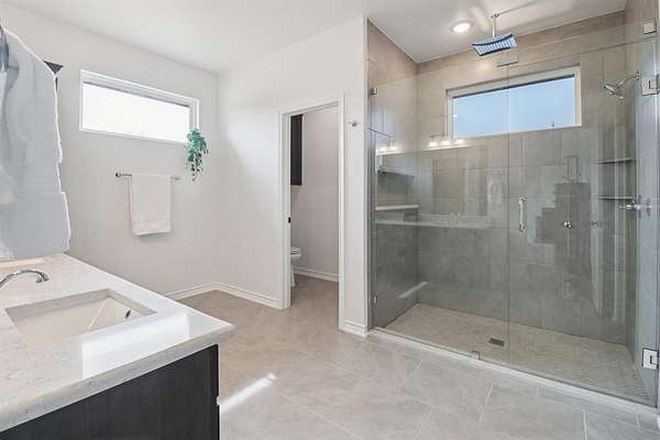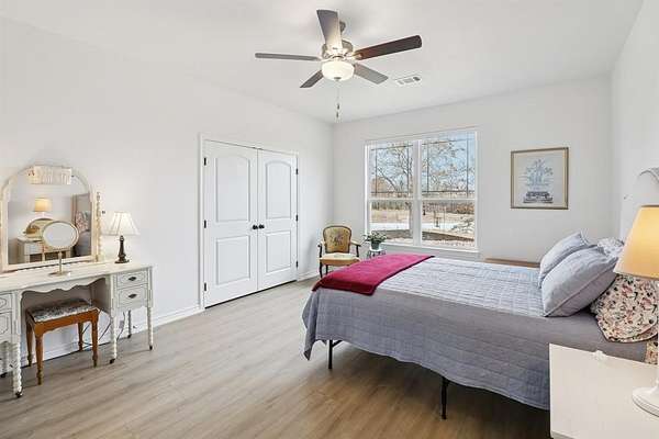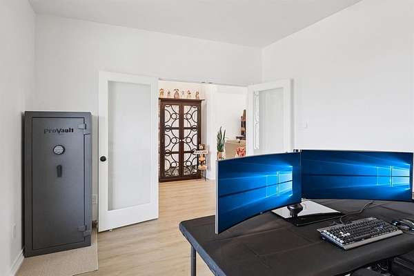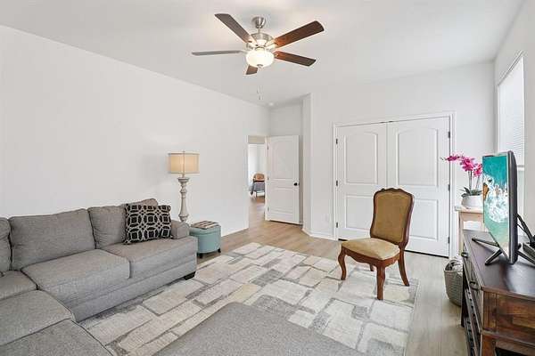 The spacious primary suite measures 17 by 15 feet and offers vaulted ceilings, dual sinks, and a large walk-in shower with rain head. A dedicated home office or optional dining room adds flexibility, along with exceptionally large secondary bedrooms, including one nearly 19 feet long.