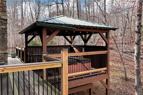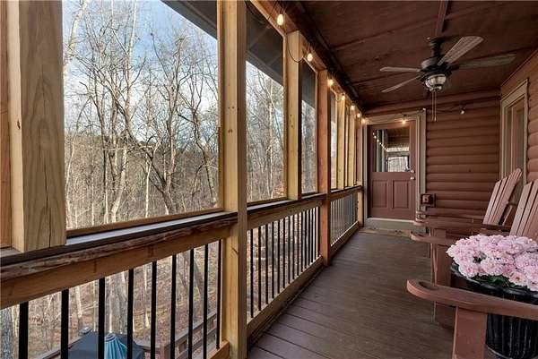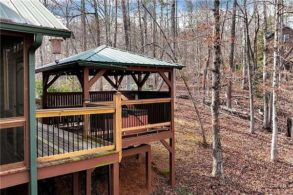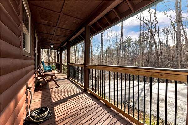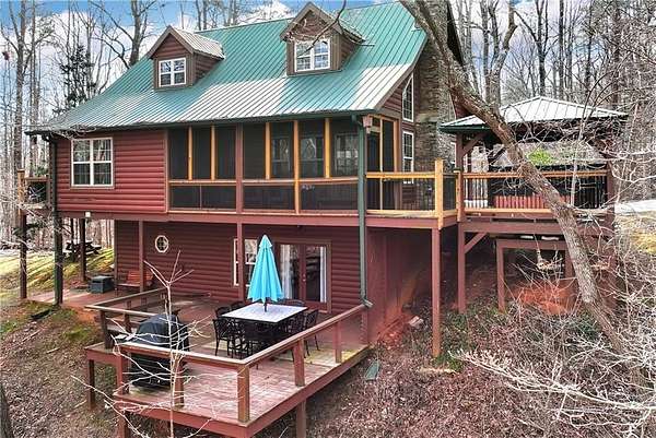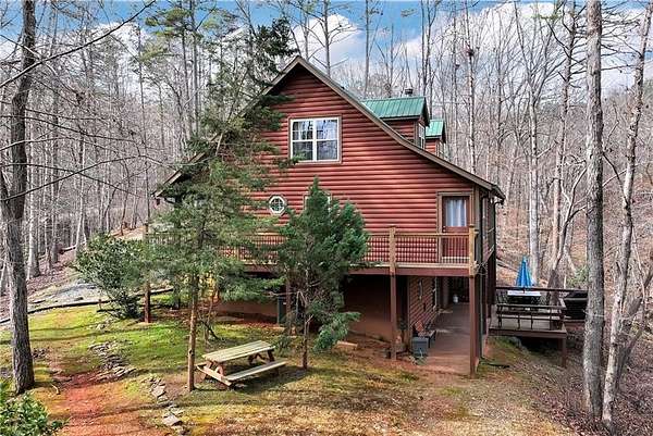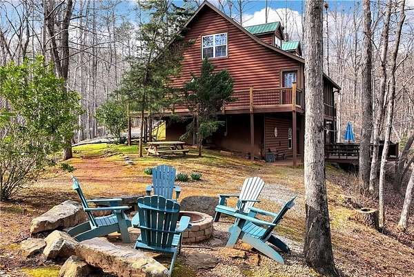 Stunning 3 bed 3 bath log cabin on 2.82 acres of serenity with a scenic rushing waterfall creek running behind the property. Impeccably maintained, gleaming hardwood floors, stacked stone fireplace, vaulted ceilings and upgraded luxury kitchen overlooking peaceful wooded setting. New HVAC 2024! Primary Bedroom on Main with sitting area overlooks wooded setting and connects to new, covered deck for sipping morning coffee. Terrace level features a game room with den and bunk beds, and a bedroom with full bath and laundry. Can easily sleep 11. Relax in the hot tub under the gazebo or sitting around the fire pit listening to the babbling brook below. Ideal setting feels tranquil yet still close to shopping, dining and schools. This is an Active Short Term rental property, please allow 24 hour notice for showings. Ready to move in, most furnishings can stay!
