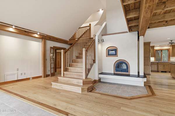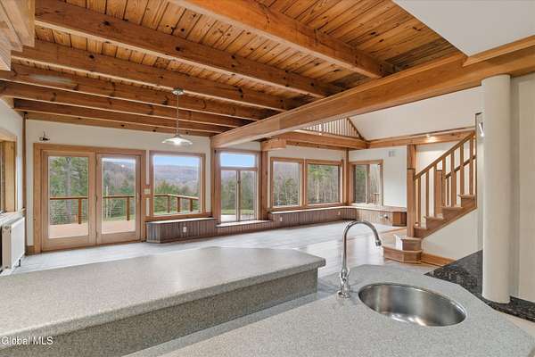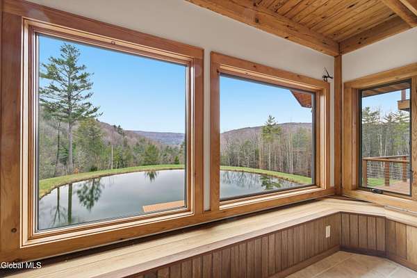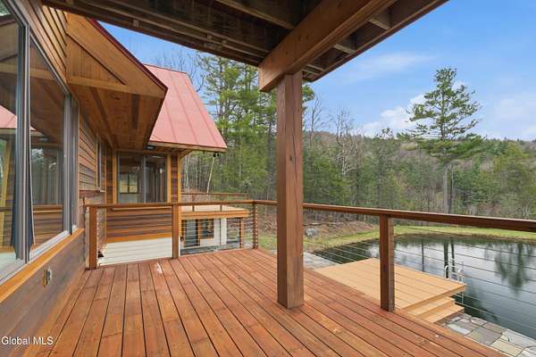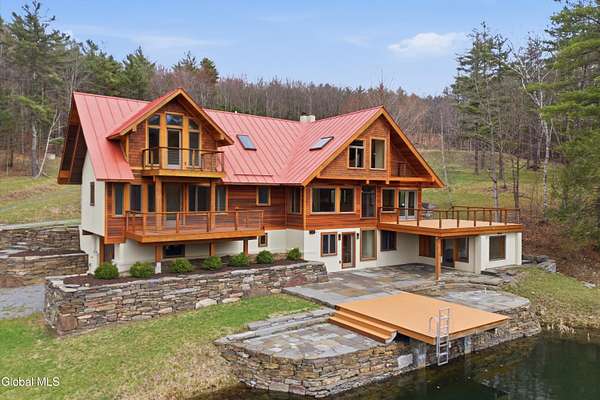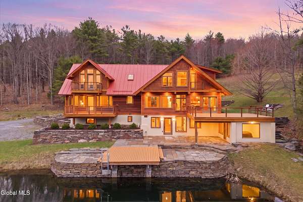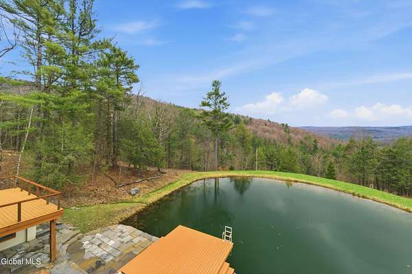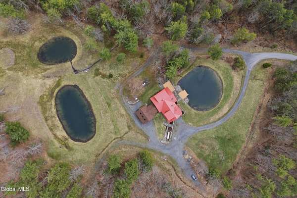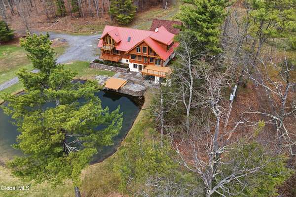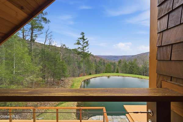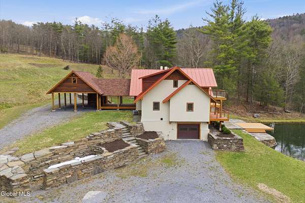 There's a quiet kind of luxury that comes from space, elevation, and complete privacy. This property captures it effortlessly. Perched high at 1,450 feet, 165 Vaughn Hill is a private retreat set on 15+ acres and surrounded by protected state land. The approach alone sets the tone: a winding, gravel drive opens to a Bluestone-framed entrance with thoughtfully designed gardens, and three spring-fed ponds that quietly anchor the landscape. The home is filled with natural light and framed by views in every direction. The Great Room is the heart of it all - centered around an Enviro-Tech masonry heater that brings both warmth and a sense of craftsmanship to the space. The kitchen is equally intentional - featuring Mountaineer Oak cabinetry, high-end stainless appliances, and a wet bar - designed for both everyday living and effortless entertaining. This private oasis offers flexibility for hosting, retreating, or simply spreading out and enjoying the quiet. Above the carport sits a bonus skylit loft space - perfect for an art studio, reading room, yoga, or anything you can imagine. The lower level of the main house adds even more versatility - complete with a summer kitchen, office or gym space, and a stone patio overlooking the swimming pond - a setting that feels both grounded and expansive. Bordering Dutton Ridge State Park, the property offers direct access to nature while still being within reach - about 30 minutes to Windham and Hunter Mountain, less than an hour to Albany, and roughly three hours to NYC. A retreat in every sense of the word. (The revised tax estimate below is based on the anticipated reduction from new tax roll in May; the current annual taxes are $30,000.)