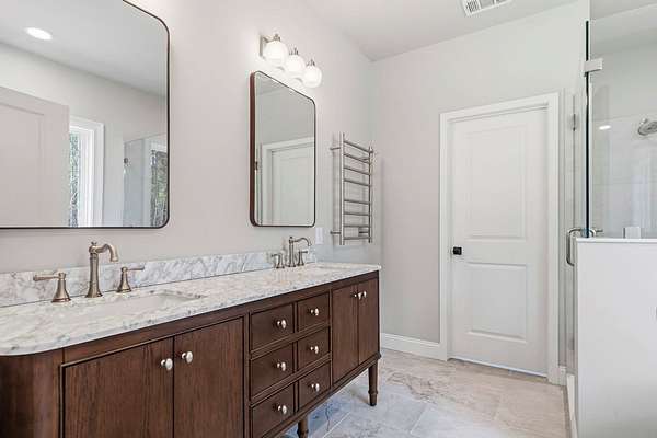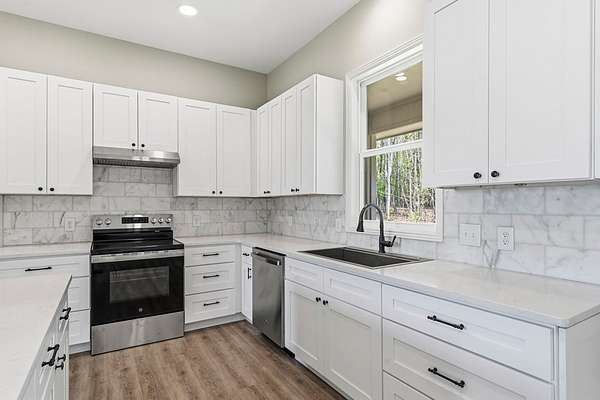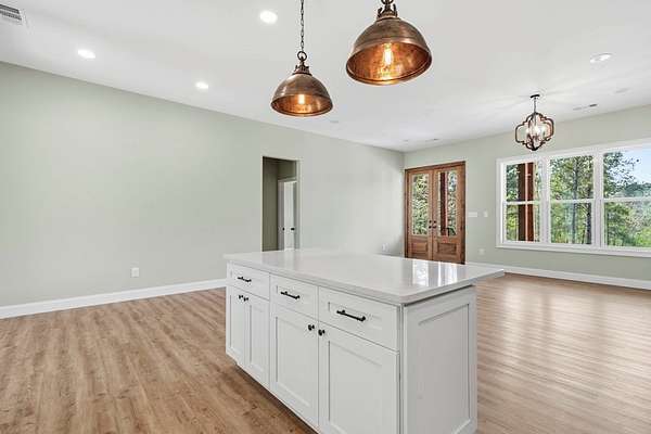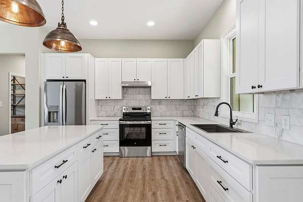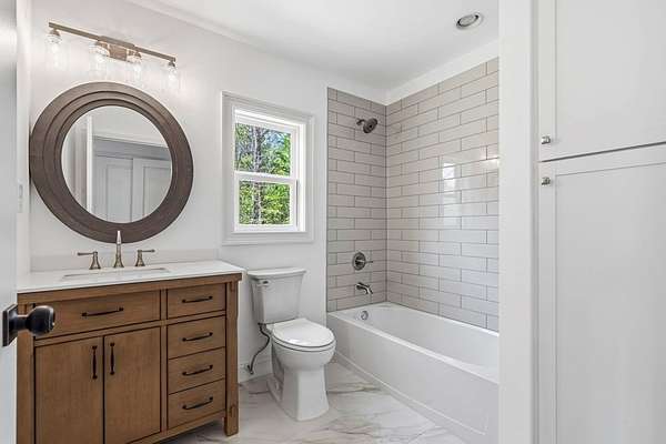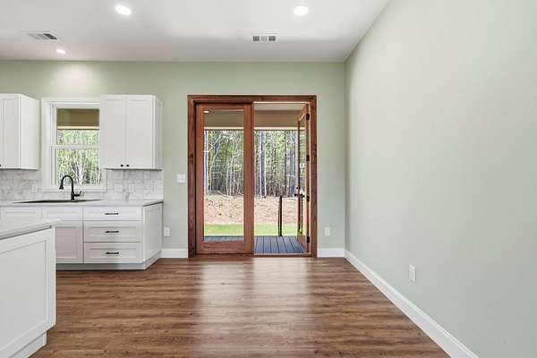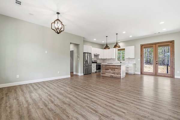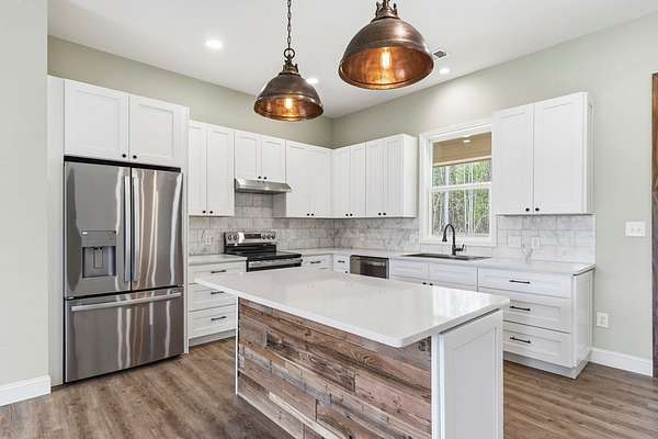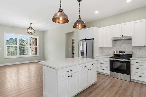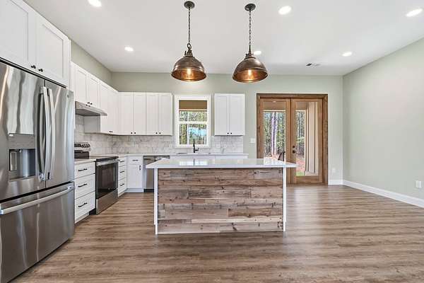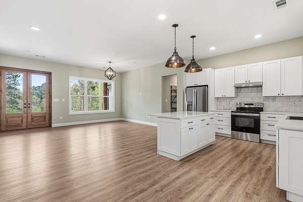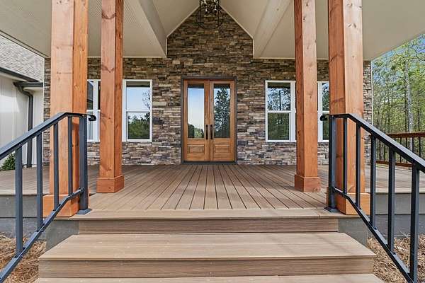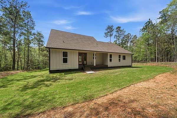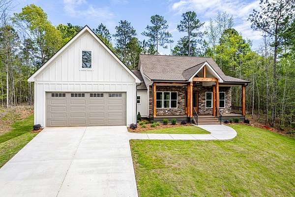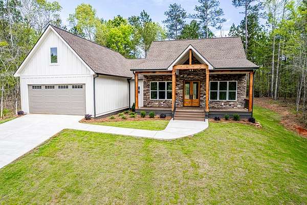 Beautiful New Construction in the Lake Oconee Area! Located in a sought-after Lake Oconee community with easy lake access (without the lakefront price), this thoughtfully designed home sits on a private 2.23-acre lot surrounded by mature shade trees-offering both space and serenity just minutes from downtown Greensboro. From the solid poured foundation and stone-accented exterior to the inviting rocking chair front porch and 8' double entry doors, quality craftsmanship is evident throughout. Inside, the open-concept layout features 9-10 ft ceilings, waterproof SPC vinyl flooring, custom lighting, and abundant natural light. The gourmet kitchen is designed for entertaining with a large island, quartz countertops, marble backsplash, custom all-wood soft-close cabinetry, stainless appliances, and a spacious pantry with furniture-grade shelving. The split-bedroom floor plan offers privacy, with a luxurious primary suite featuring a vessel tub, tiled shower with frameless glass, dual vanity, and a custom closet with built-ins and direct access to the laundry room. Secondary bedrooms are well-appointed with a stylish shared bath. Upstairs, a versatile bonus space with a full bath provides the perfect guest suite, office, or flex space. Additional highlights include a 2-car garage with epoxied floors, TREX front porch and rear deck, and sodded yard. No HOA and just minutes to Greensboro-this is a rare opportunity for new construction in the Lake Oconee area.