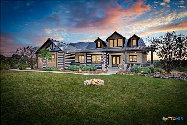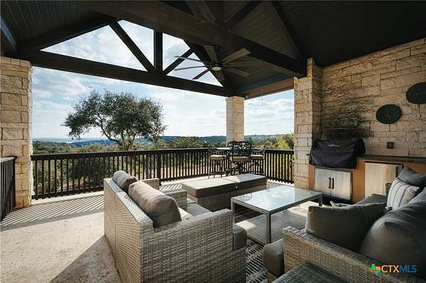 Perched on a 1.67-acre elevated Lake Ridge lot with serene country and lake-area views, this custom single-story home reflects exactly what today's Canyon Lake buyers are seeking - open, light-filled living, privacy, outdoor amenity spaces, and room for lake toys and hobbies, all while remaining convenient to San Antonio. The island kitchen flows seamlessly into the dining and living areas, anchored by high ceilings, wood and tile flooring, and custom cabinetry. The thoughtful floor plan includes a private main suite with luxury bath, two additional ensuite bedrooms, and a dedicated office currently used as a fourth bedroom - offering flexible space for work-from-home or guests. Step outside to a deep covered patio with built-in outdoor kitchen and gas grill, ideal for everyday enjoyment and entertaining. The long drive and expansive 3-car garage provide ample boat, kayak, vehicle, or workshop storage. Low-maintenance landscaping, a metal roof, and sprinkler system enhance everyday convenience. Located minutes from popular boat ramps, marinas, the Guadalupe River, and local conveniences in Canyon Lake and New Braunfels - and within easy reach of San Antonio and Austin... The win-win is Comal ISD schools, low annual HOA dues, and no city taxes, this home works equally well as a long-term residence or lock-and-leave Hill Country retreat.