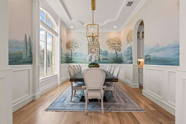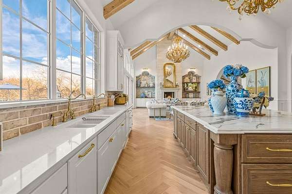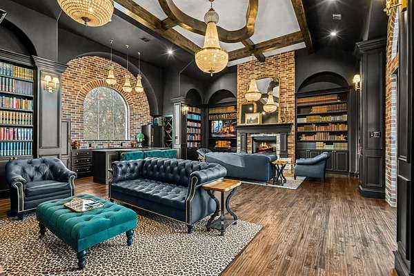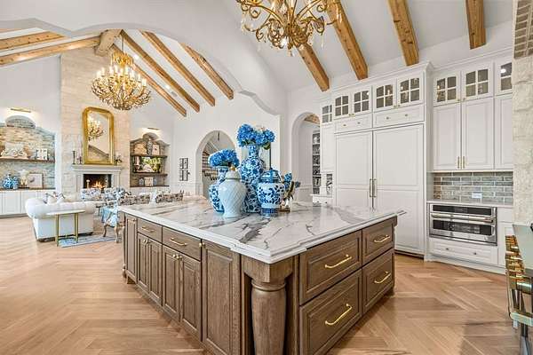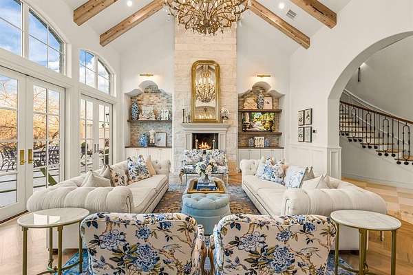 Tucked behind beautiful private gates and a canopy of towering trees on 10 pristine acres in Aledo, this extraordinary French Country estate offers a rare blend of privacy, craftsmanship, and thoughtful design just five minutes from Press Café and I-20. A grand entry foyer welcomes you with light checkered tile flooring, soaring ceilings, flanked by a formal dining room and designated study. Beyond the foyer, the home opens into the heart of the living spaces where dramatic cathedral ceilings in the living room and kitchen create an incredible sense of scale and light. The chef’s kitchen, accented with warm brick and stone, features a massive island, butler’s pantry, and herringbone wood floors that continue into the living area. Picturesque windows throughout fill the home with natural light and frame views of the surrounding acreage. The living room is anchored by a grand floor-to-ceiling stone fireplace, flanked by built-ins with brick accents. One of the home’s most unforgettable spaces is the grand bibliothèque an extraordinary library featuring dual fireplaces, custom built-ins, a full bar with ice machine and refrigerator, creating the perfect setting for entertaining or quiet evenings. Entertainment continues with a first-floor theater room. The primary suite, features paneling, rich hardwood floors, a fireplace, while the spa-inspired bath showcases polished neutral checkered flooring, a walk-through brick shower, and a freestanding soaking tub. Separate his-and-her closets provide exceptional storage. A laundry within the primary closet adds everyday convenience. Built with exceptional efficiency, the home is fully encapsulated with spray foam insulation for year-round comfort. Additional highlights include a five-car garage, spacious guest suites, and a thoughtfully designed floor plan with no wasted space. A survey, pool renderings, and build plans are available upon request. Select furnishings are available to purchase upon request.