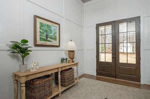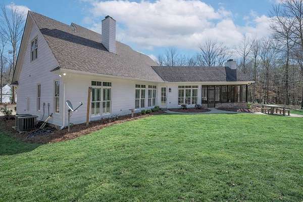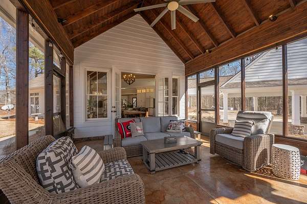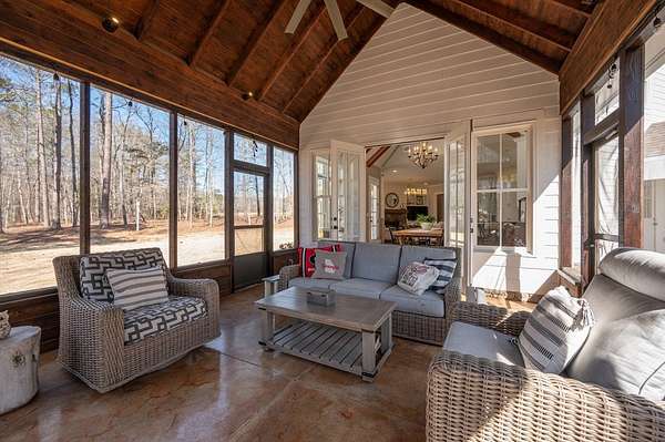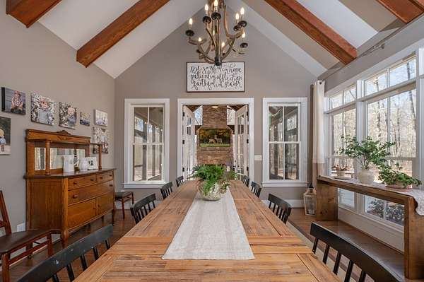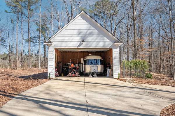 Set behind a gated, winding drive on 12 rolling, wooded acres in Harris County, this custom Leary & Brown home offers privacy, craftsmanship, and a true sense of retreat. Surrounded by stunning landscaping and scenic views, the home features an open main-level floor plan filled with exceptional natural light from expansive windows throughout. The great room showcases a fireplace with built-ins and flows seamlessly into a generous gathering-style dining area that opens to a beautiful screened porch with its own fireplace-perfect for entertaining or quiet evenings at home. Unique ceiling details add architectural interest throughout the main living spaces. The main-level primary suite provides privacy and comfort with a spacious ensuite bath featuring a large tiled shower, soaking tub, dual vanities, built-ins, and a custom walk-in closet. Also on the main floor are a half bath and laundry. Upstairs includes two additional bedrooms, a full bath with double vanity, and a small bonus room ideal for an office or fitness space. Outdoor amenities include a patio and fire pit area, exceptional additional parking, a three-car carport connected by a breezeway, and a detached 24x32 garage with extra-high ceilings-ideal for camper storage or workshop use. A rare combination of acreage, thoughtful design, and peaceful Harris County living.