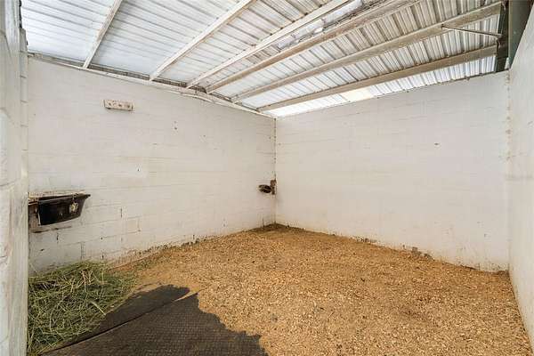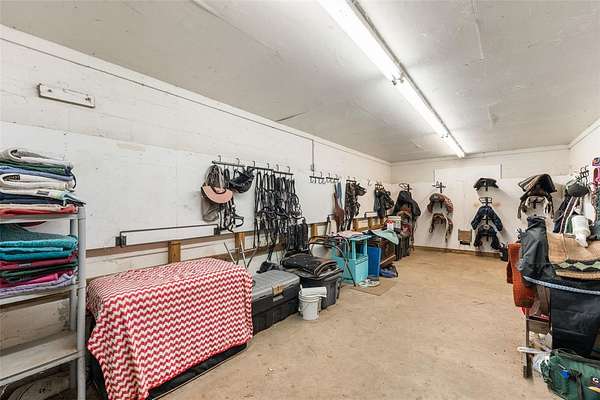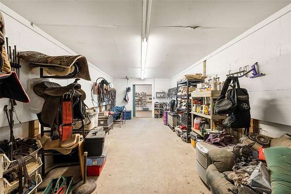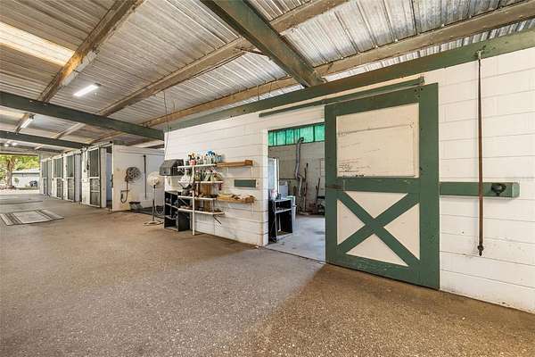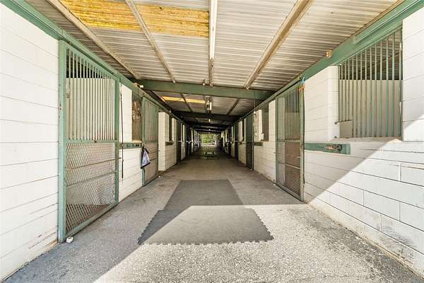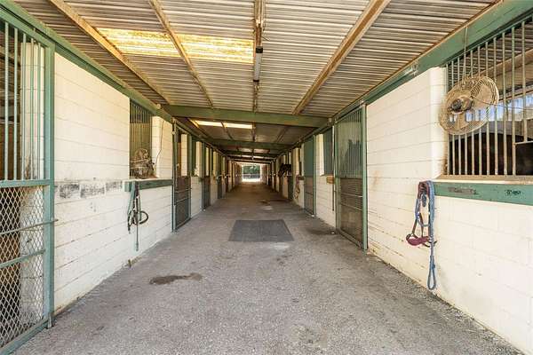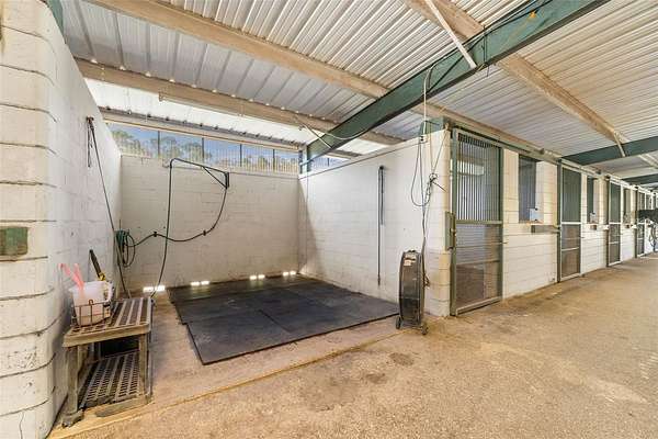 At the center of the property is a substantial concrete block barn with metal roof and truss construction, built for durability, safety, and long term use. The barn includes 40 stalls, automatic waterers, multiple tack and feed rooms, a fly system, six wash racks including one with hot water, and an efficient layout designed for daily operation.