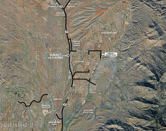 Est $3,942/moRARE ORACLE ROAD FRONTAGE -- +/- 2.3 ACRES, CB-2 ZONING (CATALINA, AZ) Outstanding commercial development opportunity featuring 650+ ft of State Hwy 77 frontage in Catalina. 2.3 acres, CB-2 Commercial zoning, and all utilities available (Tucson Water, TEP, Pima County Sewer, Southwest Gas). Suitable for retail, auto/RV, self-storage, office, hospitality, contractor yard, and more. Surrounded by Saddlebrooke, Saddlebrooke Ranch, Eagle Crest and other thriving communities with strong traffic counts. Buyer to verify all information. Ask Broker for a detailed Marketing brochure with more information.
