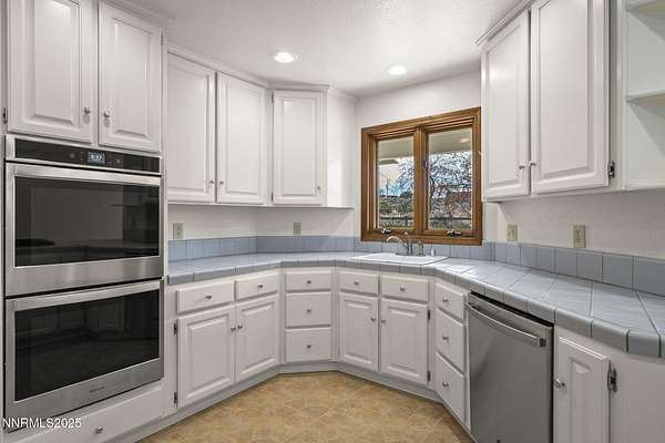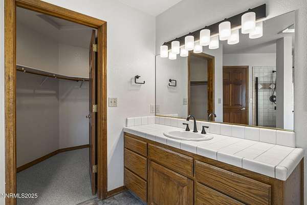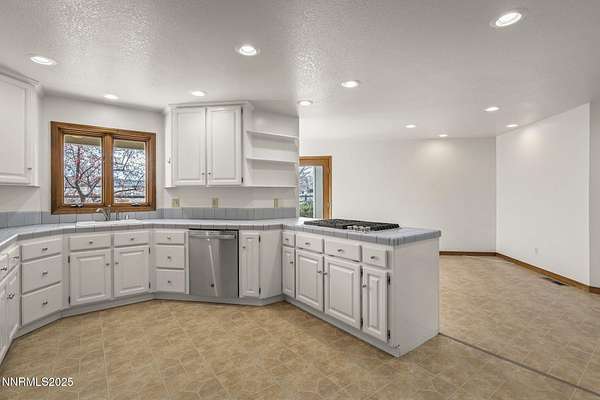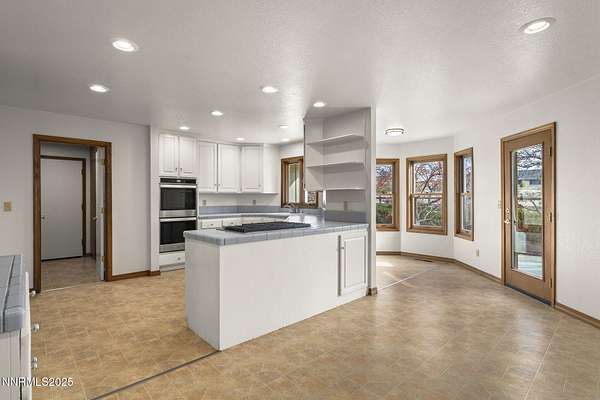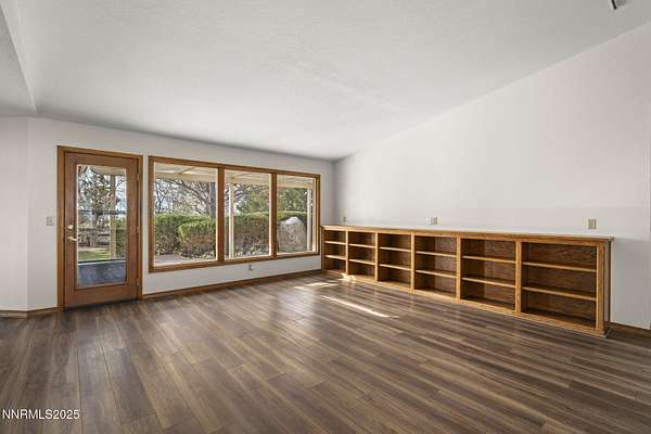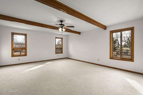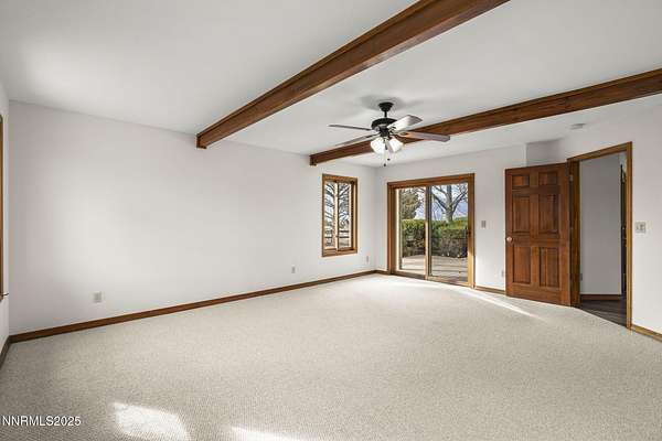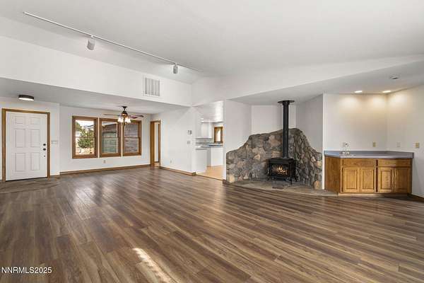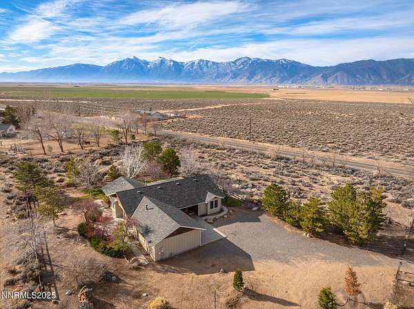 Experience true Nevada living on 2.6 private acres overlooking the Carson Valley and the Sierra Nevada range, where mountain views stretch across the horizon and quiet country living unfolds in every direction. Set in a rural estate community surrounded by ranch properties and open land, this custom-built home offers privacy, natural beauty, and the freedom to create the lifestyle you choose, from horses and hobby farming to room for workshops, RV storage, and more. A gated entrance and tree-lined approach welcome you into a property tucked thoughtfully toward the front of the lot, maximizing the expansive open acreage behind the home. With sweeping views of mountains, fields, and desert sage, the land feels open and inspiring, surrounded by the peaceful character of the valley. Inside, fresh interior and exterior paint and new flooring create an inviting, updated feel throughout the home. The vaulted great room captures views through tall windows that fill the space with natural light. A dramatic rock-faced hearth with a freestanding wood stove anchors the room with mountain-lodge character, complemented by full-length built-in bookcases and an adjoining wet bar designed for entertaining. Step outside to a pergola-covered deck and shaded sitting areas surrounded by rock accents, mature trees, and fenced green space, perfect for outdoor dining, morning coffee, or simply taking in the quiet. The primary suite provides privacy and access to the deck, along with exposed beams, a walk-in closet, and a spacious bathroom featuring a soaking tub and separate tiled shower. Two additional bedrooms each offer thoughtful features, one with a private en-suite bath and window seat storage, and the other with direct exterior access and a built-in desk, ideal for a home office or guest quarters with its own entrance. The bright kitchen includes double ovens, a downdraft cooktop, stainless appliances, and a sunny bay-window breakfast nook. The home is complete with central air conditioning and the significant benefit of a private well and septic system, helping reduce utility costs and offering self-sufficient living. With level land ready for horses, barns, gardens, trailers, or a shop, this property invites flexibility and independence. Here, nights are filled with stars instead of streetlights, and days open to the uninterrupted peace of wide-open valley living. This is pure Nevada lifestyle, spacious, scenic, and free, paired with thoughtful construction and timeless design. This is your chance to enjoy acreage living paired with unforgettable valley and mountain views.