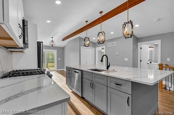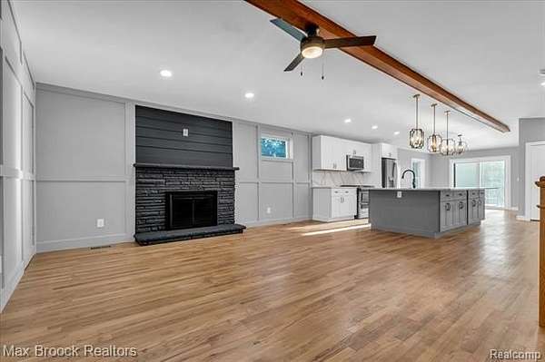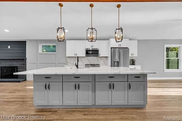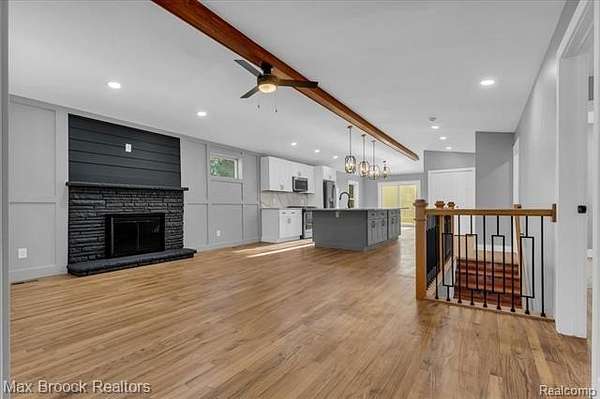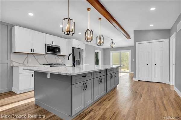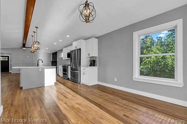 Welcome to your beautifully renovated ranch -- completely updated from top to bottom! This stunning raised ranch offers 5 bedrooms, 3 full baths, and over 3,000 square feet of finished living space, perfectly situated on 4.01 acres of peaceful privacy. Step inside and be greeted by an inviting open-concept layout. The spacious living room features a natural fireplace and seamlessly connects to the dining area and chef's kitchen. Enjoy an oversized quartz island with ample seating, soft-close cabinetry, and abundant storage -- perfect for gatherings and everyday living. A front-entry mudroom/laundry area provides convenience, while a stylish office with glass French doors offers the perfect work-from-home setup. The main level includes three generous bedrooms, including a tucked-away bedroom off the living area. Don't miss it! The primary suite features a walk-in closet and a beautifully designed ensuite bath. Red Oak hardwood floors flow throughout the main level, adding warmth and elegance. Great natural light throughout. The finished lower level provides even more living space -- ideal for entertaining, a family room, or guest quarters -- with two additional bedrooms, a walkout to the backyard, and a second laundry hook-up for added flexibility. Step outside to enjoy the 16x30 cedar deck overlooking your private backyard oasis. Major updates include a roof, HVAC system, A/C, and all-new Anderson windows. This home is truly move-in ready -- every detail has been thoughtfully updated for modern comfort and style. BATVAI. Bonus: Lot split available!