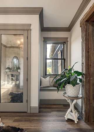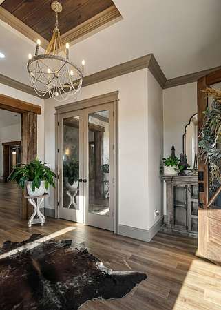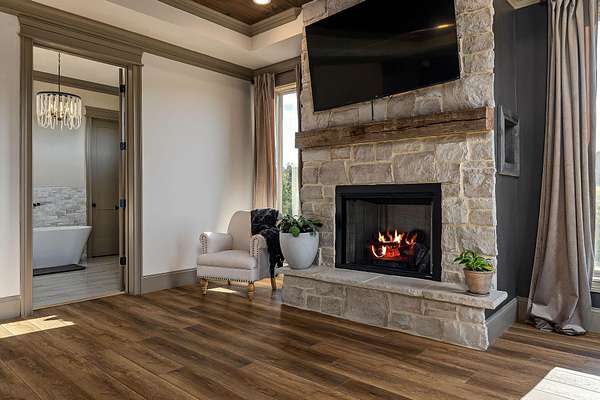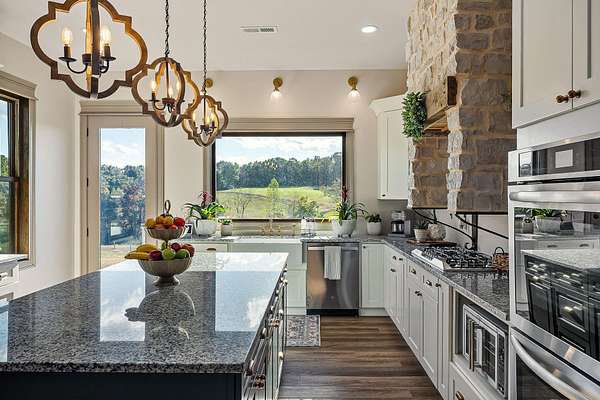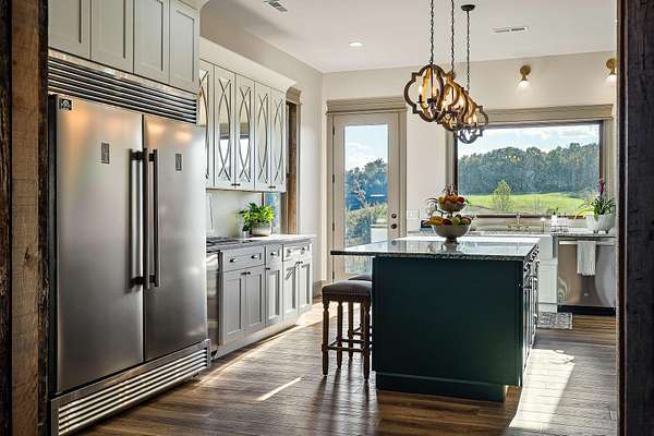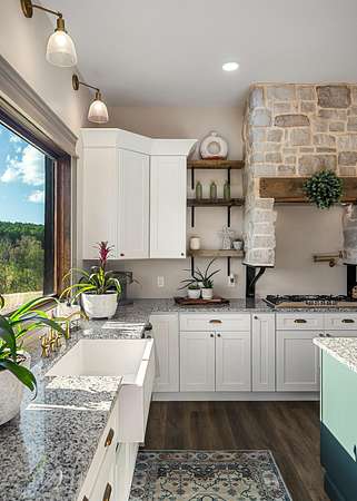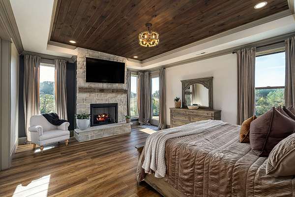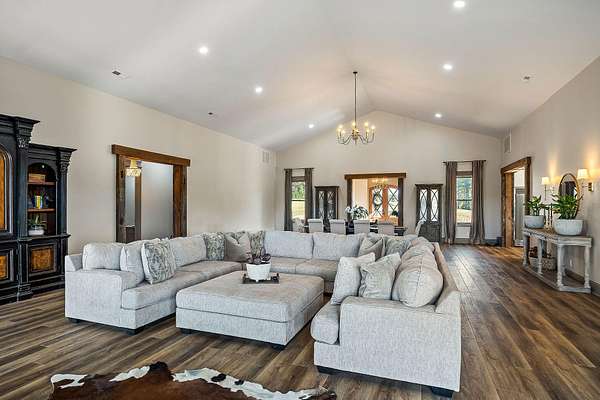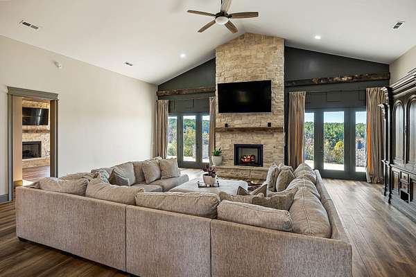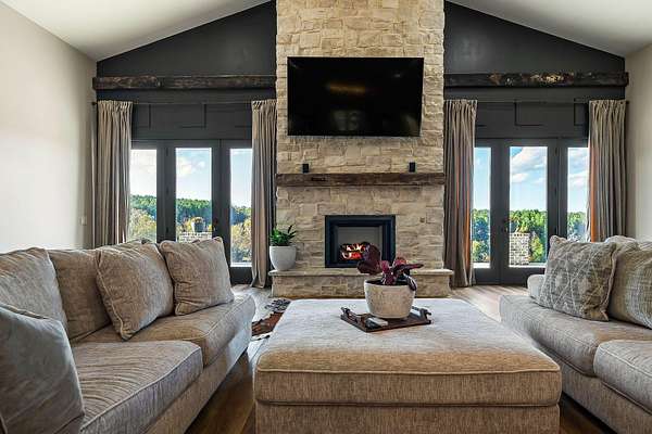 Step inside to find a spacious open-concept layout featuring soaring ceilings, reclaimed wood accents, and an abundance of natural light. The gourmet kitchen is equipped with custom cabinetry, stainless steel appliances, and a large island ideal for gathering. The inviting living area centers around a warm, welcoming fireplace that perfectly frames the sweeping views just beyond the windows.