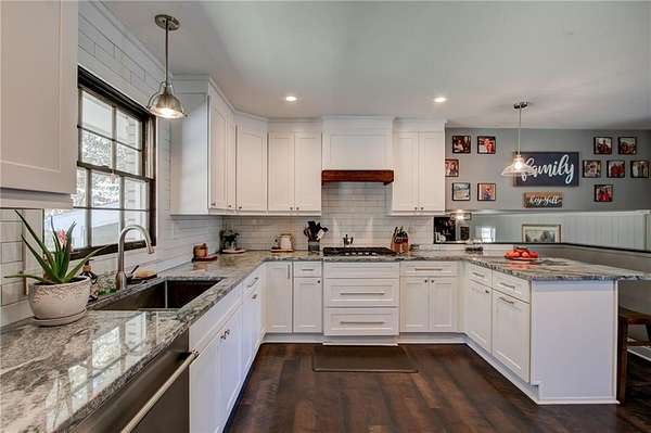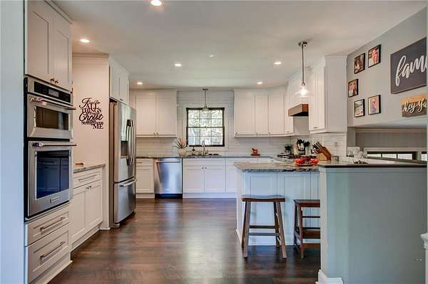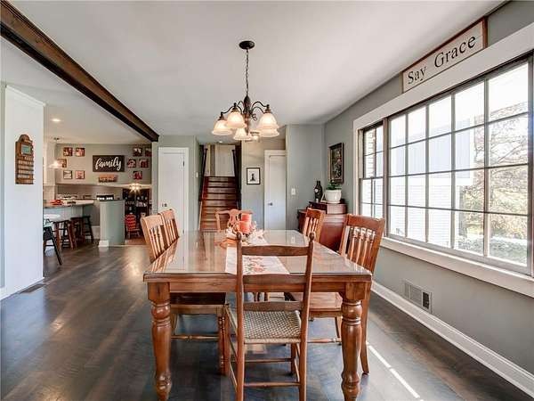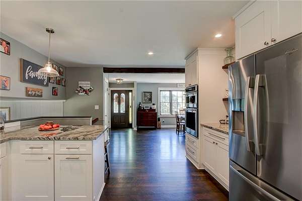 Inside, you'll find a thoughtfully renovated kitchen featuring sleek stainless steel appliances and crisp white cabinetry, perfect for family meals or entertaining guests. To the left, the formal dining room is generously sized and boasts a large picture window overlooking the courtyard and front yard. Opposite the dining area, a cozy den or office space offers flexibility to suit your lifestyle needs.