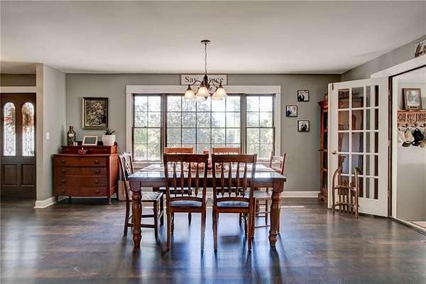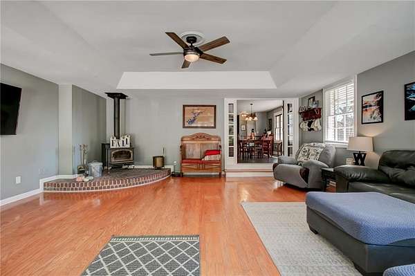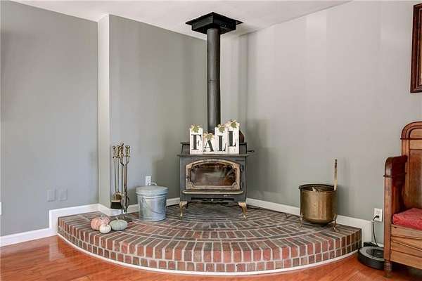 Continuing through the dining room, you'll step down into a spacious den/family room with large glass doors that bring the outdoors in. A wood stove on a classic brick hearth adds warmth and ambiance, making this room a favorite gathering spot.