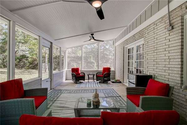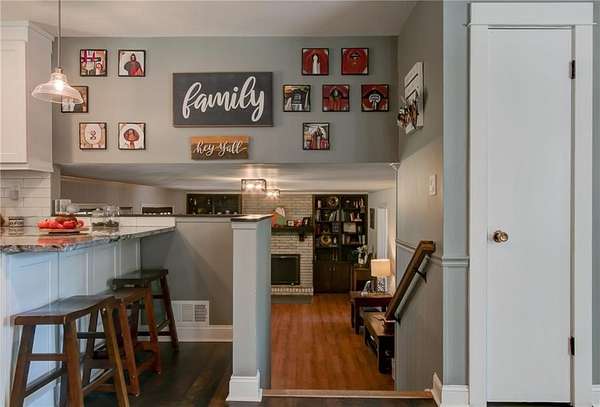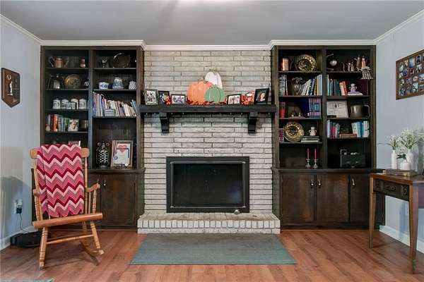 A few steps to the right lead to a cozy living/play room centered around a charming brick fireplace, flanked by built-in bookshelves that add character and functionality. This inviting space opens to a screened porch, ideal for enjoying morning coffee or evening relaxation while taking in views of the expansive backyard and grazing deer and other wide life.