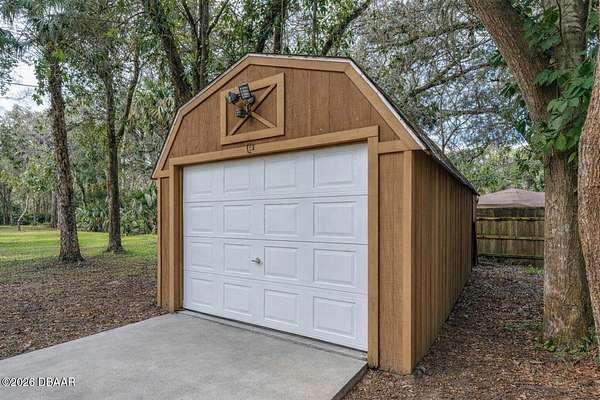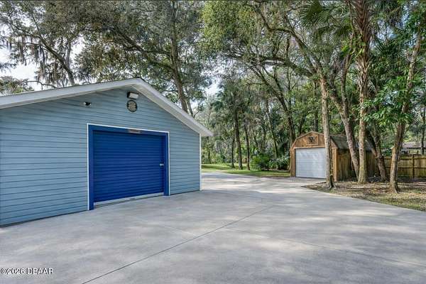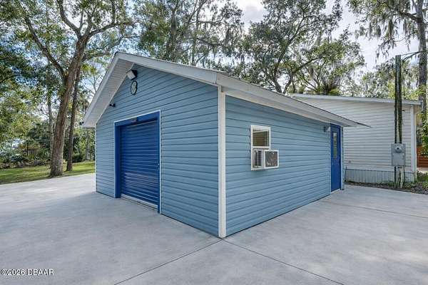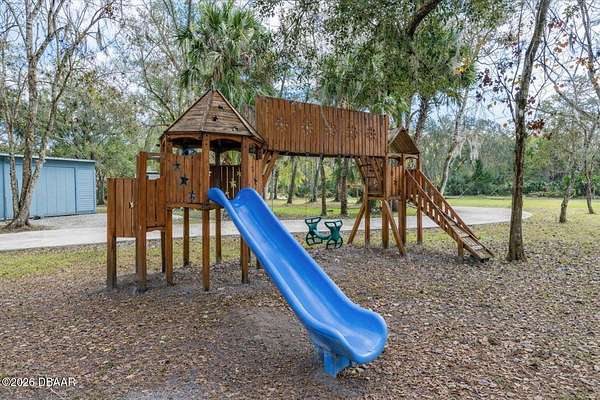 Ready to bring the animals and start your homestead dream? Enjoy 2.5 acres of freedom and privacy in beautiful Edgewater! This charming 3-bedroom, 2-bath country retreat offers the perfect blend of rustic character, modern upgrades, and wide-open space. This property is ideal for anyone craving privacy, land, and a lifestyle that feels a little more ''back-to-nature.'' Need space for tools, toys, or projects? You've got it! Enjoy tons of storage with a 20x20 detached 2-car garage with concrete floor, an 11x30 shed, RV Hookup, and a 17x17 pole barn perfect for equipment, workshops, tack storage, or extra space for hobbies. Inside, you'll love the warm farmhouse feel with detailed hand-carved knotty pine beadboard walls and updated wood plank flooring throughout. The beautifully upgraded kitchen is the heart of the home and truly a showstopper complete with hand-carved solid wood cabinets, built-in pantry, granite countertops, hammered copper sink, island with cooktop, plus a built-in wall oven and microwave perfect for effortless cooking and entertaining. Step outside and soak in your private slice of paradise from the oversized 26x18 porch, surrounded by lush natural views and endless possibilities. Whether you're dreaming of chickens, goats, horses, a garden, or simply room for the dogs to run this property delivers. This manufactured home is built for relaxing and making memories with an above-ground pool, firepit area, custom wooden playset, and an adorable backyard treehouse retreat that feels straight out of a country storybook. You'll love the estate-style wrought iron gated entrances and large circular concrete driveway that loops around the property giving you separate entrances for convenience. Want to cozy up by the fireplace after a long day, there's a huge stack of firewood already cut and ready on-site. Escape to the upgraded primary suite to indulge and soak the day away in the remodeled bathroom, where a luxurious oversized soaking tub invites pure relaxation. A/C was replaced in June of 2021 making it less than 5 years old and all new drainfield for septic completed in Dec. of 2024. Quiet country living with easy access to town and located close to the Intracoastal, New Smyrna Beach, and Mosquito Lagoon for boating and fishing adventures. If you've been searching for land, privacy, and a true mini-homestead lifestyle this is it. Schedule your private tour today and come experience 2.5 acres of endless possibilities.