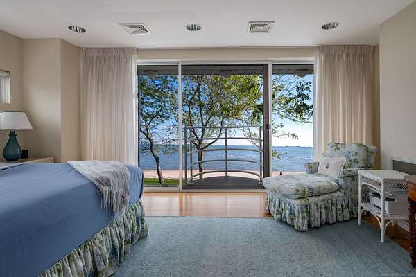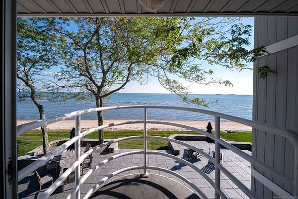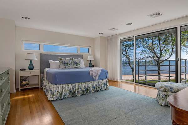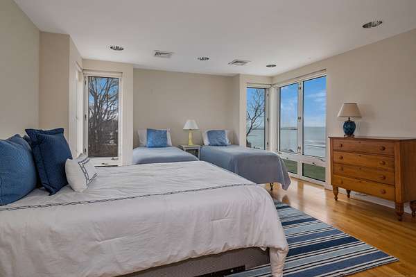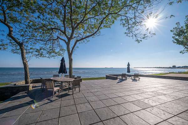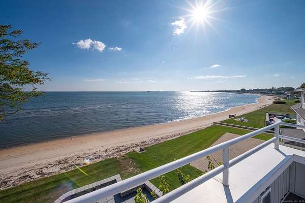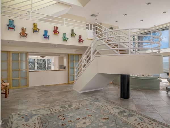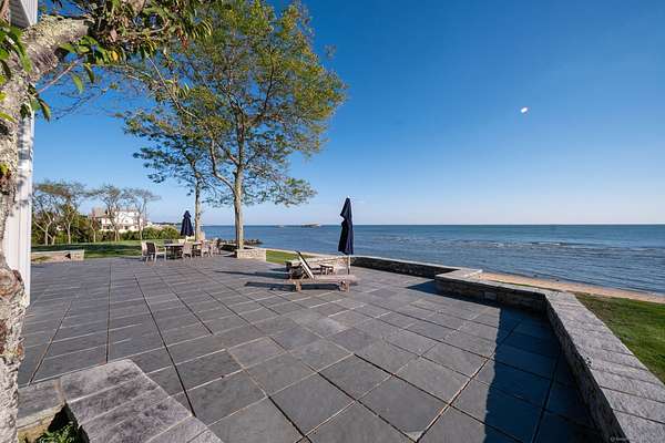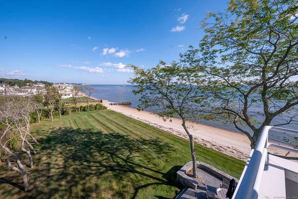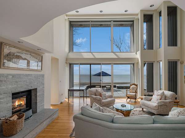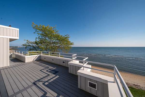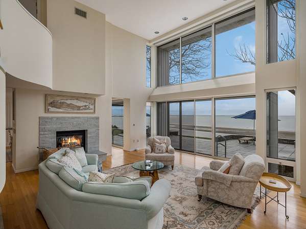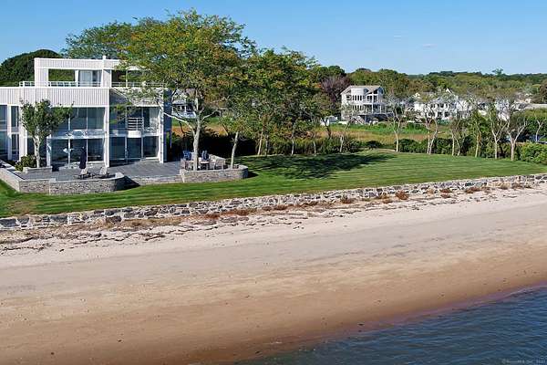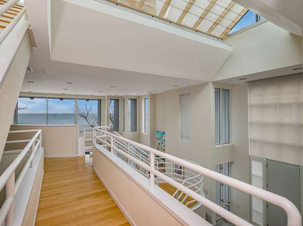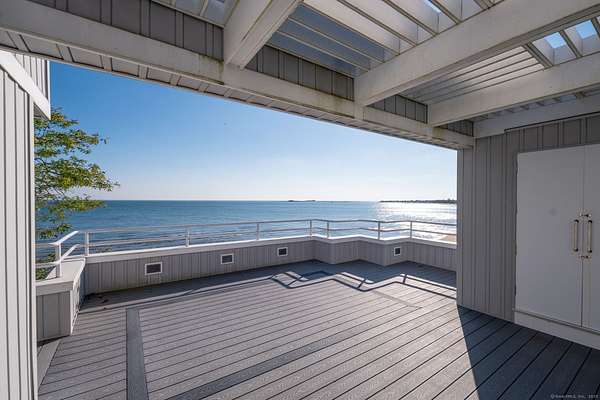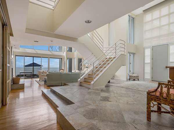 This remarkable example of contemporary design with over 175' of LI Sound frontage and 25' ceilings makes you feel you are aboard ship from the moment you step inside. All white w/clean simple lines, a commanding 2 story wall of glass showcases this beautiful direct waterfront setting in a way not possible with most traditional coastline homes. Display substantial art & furnishings in a whole new way, viewed from the vantage point of a central suspended staircase that seems to float from one level to another. The main level has a wonderful open flow, full of light & provides a comfortable alternate primary BR & bath option should you need it.The gleaming completely new kitchen & fully updated baths are just completed in 2024. 4 very spacious BR's w/baths are privately located from one another. A primary suite w/balcony on the 2nd level includes a bath with soaking tub, shower & a walk-in outfitted dressing room. An additional work/play sleep space has been created from this generous reworked floorplan up just a few steps to a 3rd floor flex space w/walls of glass. An absolute panorama of the shoreline from this room, open to a spacious rooftop patio with an overview only the seagulls otherwise enjoy.This is a sophisticated living option ideal for long stretches of multi-generational living & entertaining in all seasons. An expansive stone patio is the perfect place to relax and unwind. Room for a pool.