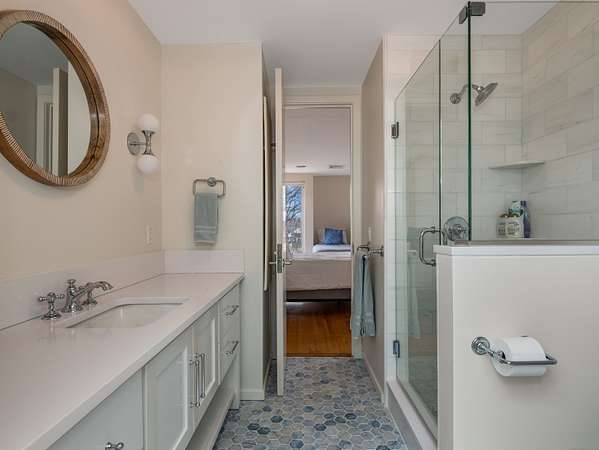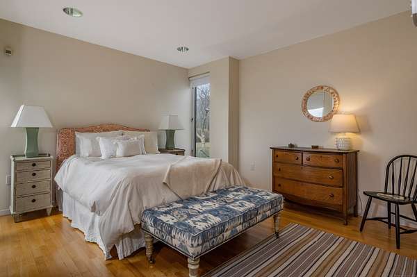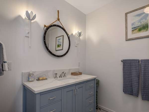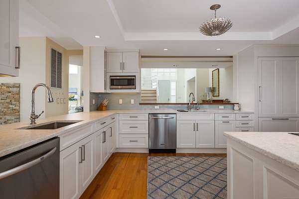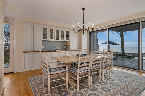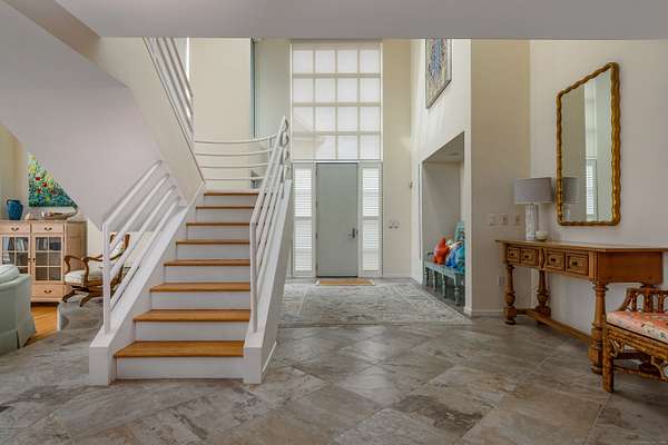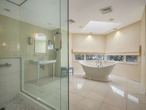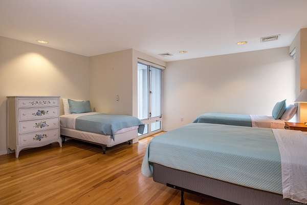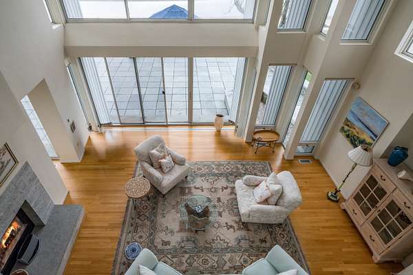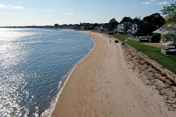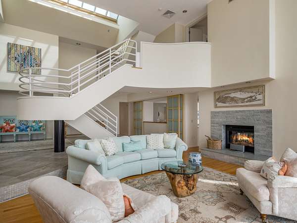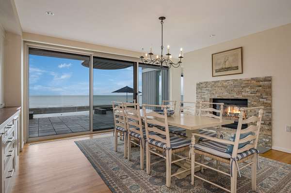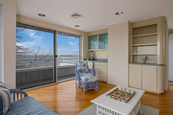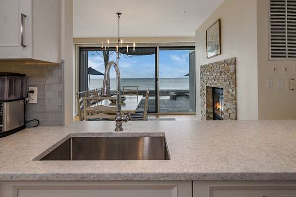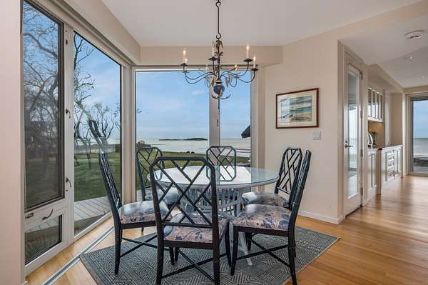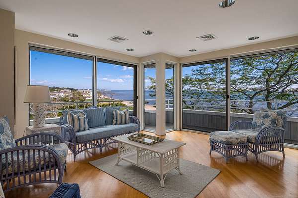 This remarkable example of contemporary design with over 175' of LI Sound frontage and 25' ceilings makes you feel you are aboard ship from the moment you step inside. All white w/clean simple lines, a commanding 2 story wall of glass showcases this beautiful direct waterfront setting in a way not possible with most traditional coastline homes. Display substantial art & furnishings in a whole new way, viewed from the vantage point of a central suspended staircase that seems to float from one level to another. The main level has a wonderful open flow, full of light & provides a comfortable alternate primary BR & bath option should you need it.The gleaming completely new kitchen & fully updated baths are just completed in 2024. 4 very spacious BR's w/baths are privately located from one another. A primary suite w/balcony on the 2nd level includes a bath with soaking tub, shower & a walk-in outfitted dressing room. An additional work/play sleep space has been created from this generous reworked floorplan up just a few steps to a 3rd floor flex space w/walls of glass. An absolute panorama of the shoreline from this room, open to a spacious rooftop patio with an overview only the seagulls otherwise enjoy.This is a sophisticated living option ideal for long stretches of multi-generational living & entertaining in all seasons. An expansive stone patio is the perfect place to relax and unwind. Room for a pool.