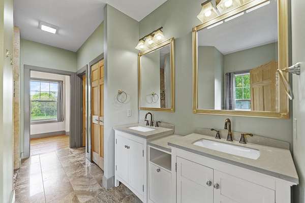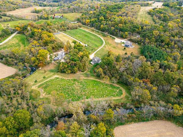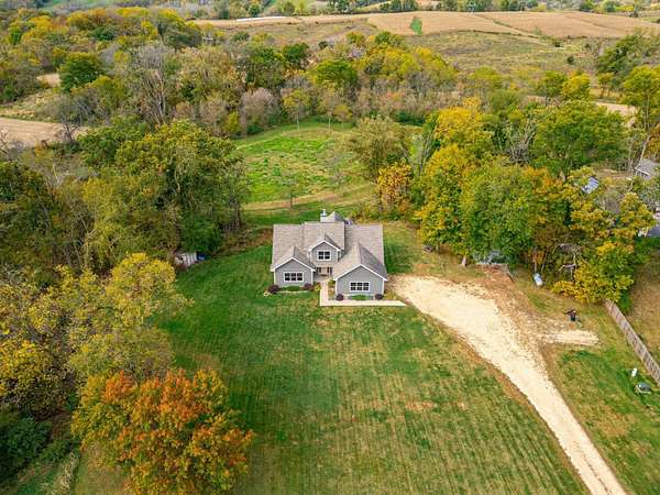 Experience refined country living at its finest in this extraordinary estate set on 10.68 rolling acres of pristine Galena countryside, where timeless craftsmanship meets modern sophistication. Built in 2013 with solid 2x6 construction and a freshly painted exterior, this residence embodies luxury, warmth, and self-sufficient living all in one. The property features lush open pastures ideal for horses, over 700 feet of peaceful creek frontage along the western boundary, and a spacious back pasture perfect for gardening, recreation, or expansion. A charming chicken coop and high-speed fiber optic internet allow you to enjoy the best of both worlds--rural tranquility with contemporary convenience. Step inside to a soaring two-story great room bathed in natural light through expansive windows framing panoramic countryside views, anchored by a floor-to-ceiling stone fireplace and rich hand-scraped acacia wood floors that flow throughout the main living area. The gourmet kitchen was designed for both beauty and function, offering Turkish travertine flooring, live-edge granite countertops and island, cherry cabinetry, stainless steel appliances, and an adjoining dining space with access to the deck for outdoor entertaining. The main-level primary suite is a private retreat featuring pine ceilings, radiant acacia wood flooring, and a spa-inspired bath with a walk-in travertine shower with stone flooring, dual vanities, a private water closet, and a large sunlit walk-in closet. Also on the main level is a guest half bath, a well-designed laundry room with built-ins and utility sink, and an attached two-car garage with in-floor radiant heat. Upstairs, a loft overlooking the great room provides a cozy space for reading or working from home and connects to two spacious guest suites--each with its own full bath for total privacy and comfort. The radiant-heated walk-out lower level offers a heated floor throughout and multiple flexible rooms perfect for a family room, gym, media area, or hobby space, plus a full bath with a wood ceiling and subway-tiled shower/tub combo. Mechanical highlights include a 200-amp electrical panel, owned water softener, well control system, furnace, and Hydra Smart in-floor heating system serving both the garage and lower level, with the A/C coil and condenser replaced in 2024 for peace of mind. Every element of this property has been thoughtfully curated for style, comfort, and long-term durability, from its elegant finishes to its energy-efficient design. Outside, enjoy the serenity of the land--pastures bordered by mature trees, the soft sound of the creek, and endless open skies that deliver stunning sunsets and peaceful mornings. Watch deer and wild turkey wander by as you sip coffee on the deck, or take advantage of the open acreage for horseback riding, gardening, or stargazing under clear rural skies. Located just minutes from Galena's historic Main Street, world-class golf at Eagle Ridge Resort, Chestnut Mountain ski area, scenic hiking and biking trails, local wineries, and charming shops and restaurants, this property delivers the perfect harmony of elegance, nature, and lifestyle. Whether envisioned as a year-round residence, weekend retreat, or hobby farm, 166 S Rocky Hill Road is more than a home--it's a sanctuary where luxury, comfort, and natural beauty converge in perfect balance.
