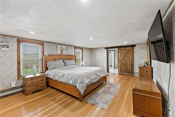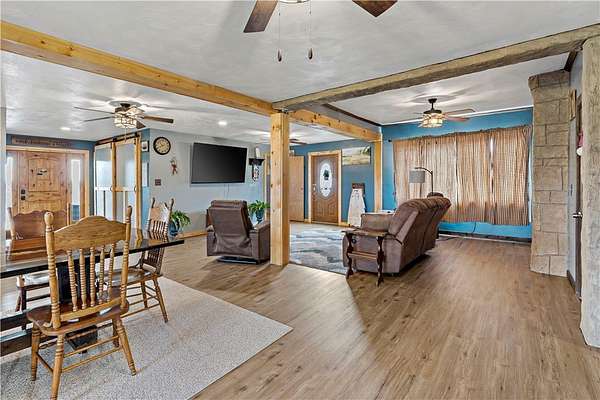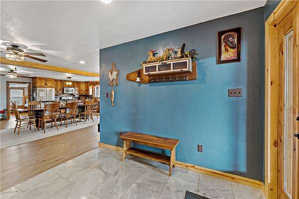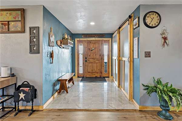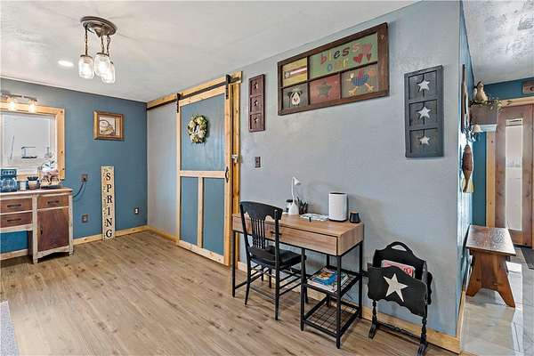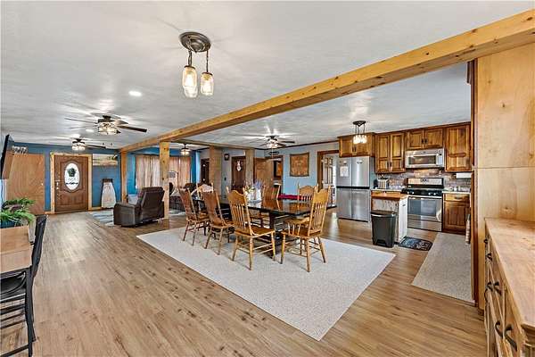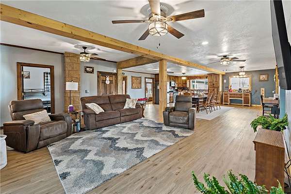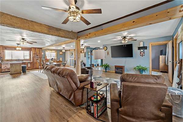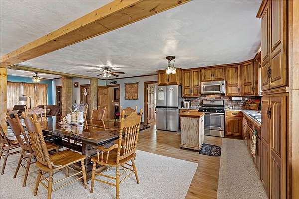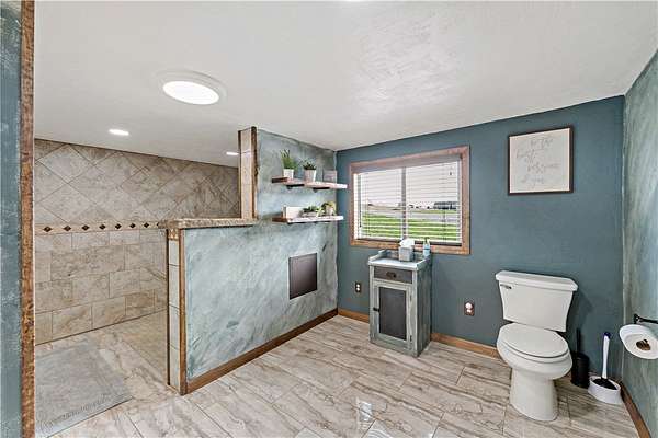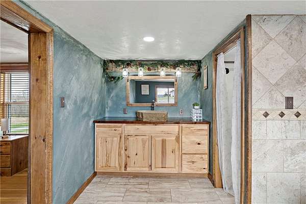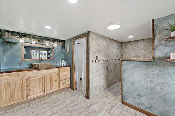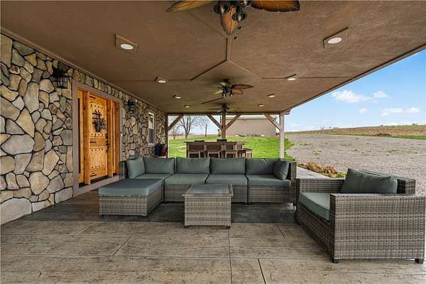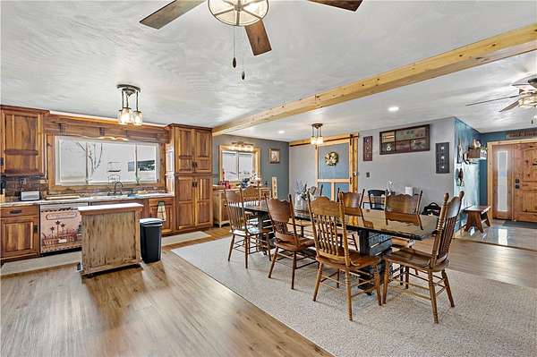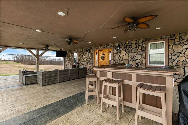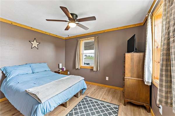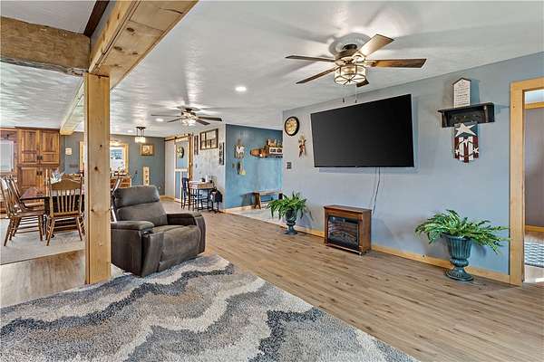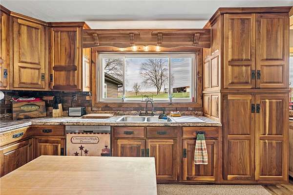 Discover the perfect blend of comfort, space, and outdoor living in this 3-bedroom ranch set on 1.5 acres of serene property, with custom updates throughout. Designed for easy one-level living, this home offers a spacious layout with generously sized bedrooms. The Primary Suite is complete with a custom Walnut vanity, an expansive walk-in closet, and anoversized custom walk-in shower that adds a touch of everyday luxury. The kitchen features ample Walnut cabinetry, stainless steel appliances (all included), and plenty of countertop space—ideal for cooking, entertaining, or simply enjoying daily life. The main living space offers an open concept with plenty of DIning room and Living Room space. A washer and dryer, just 2 years old, are also included in the sale. Step outside and experience an amazing outdoor living space. The impressive covered patio boasts stamped concrete, a beautifully designed stucco ceiling, recessed lighting, Ceiling Fans, mounted TV bracket, and heated flooring — perfect for entertaining or relaxing year-round. Outdoor furniture and the bar setup can be included, making this space truly the "go-to" spot for gatherings upon move-in. Detached 24x24 garage, complete with electricity, heat, and a half bath. An additional shed on the property provides even more covered storage space. Adding incredible value, the property benefits from Free Gas, with the current owners never having a heating bill. With its combination of indoor comfort, outdoor amenities, and expansive yard space on 1.5 acres, this property offers a rare opportunity. The home also includes an expansive basment space with a poured concrete floor, great for storage. The property has been used as a consistent and relaible Air B&B.