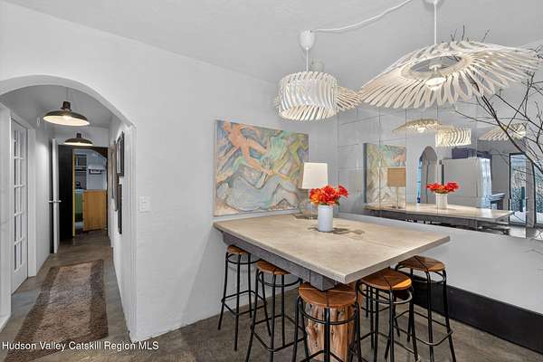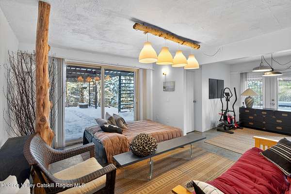 WHERE ARCHITECTURE MEETS NATURE! A rare underground retreat with walls of glass doors framing breathtaking mountain & valley vistas. Hidden in plain sight, this one-of-a-kind property offers unmatched privacy, modern style, and year-round comfort thanks to its earth-protected design. This is the Trifecta of properties - a stunning private setting, unique architecture, and endless possibilities. As you arrive, you'll pass through an arbor laden with grapes, then turn the corner to a sprawling deck running the length of the house, where panoramic mountain & valley views spill in through floor to ceiling glass doors. Inside, a distinct mid-century/contemporary vibe - crafted by the graphic designer/owner- blends polished concrete floors with creative custom touches. The 2 bedroom, 2-bath layout offers flexibility for living, entertaining, and income potential. (current STR permit in place) The decor reflects the creative colorful nature of the designer owner. At the far end of the home, the Second Bedroom functions as a private guest suite with its own entrance, deck and gardens - all oriented toward the toward the sweeping mountain & valley views. A privacy fence ensures seclusion, while a stylishly designed bath and well-equipped kitchenette with custom finishes make it perfect for extended stays for guests or family that appreciate their own private space or continued use as an Airbnb (permit in place). Above the main home sits The Cottage, a self-contained retreat with its own driveway and parking area. Here, an expansive deck, charming Kitchen, bath and gas woodstove, and floor-to-ceiling glass doors bring the beauty of nature in all its glory into every moment, when indoors and outside. The cottage is also Airbnb-permitted and ADU-approved, offering even more flexibility for use as a guest house, income rental, or insuring studio/office space. The bedrooms & bathrooms listed are as follows: The main house has 2 br/2ba. The separate cottage which is self contained and has 1 BR/1BA and is 320 Sq ft. The square footage in the listing does not include the cottage square footage. The property is privately situated by lush natural gardens, with a huge field of ferns leading to the creek below and spectacular mountain views. Whether you're seeking a full-time residence which affords an abundance of uses or a serene escape, this is a once-in-a-lifetime opportunity to own and call one of the area's most distinctive and unforgettable property your home. Located just minutes to the beautiful Spruceton Valley where you can enjoy fishing, hiking or spending time at the ever popular WEST KILL BREWERY as well as the close proximity to some of the best skiing and festivals in the area at Hunter Mountain.