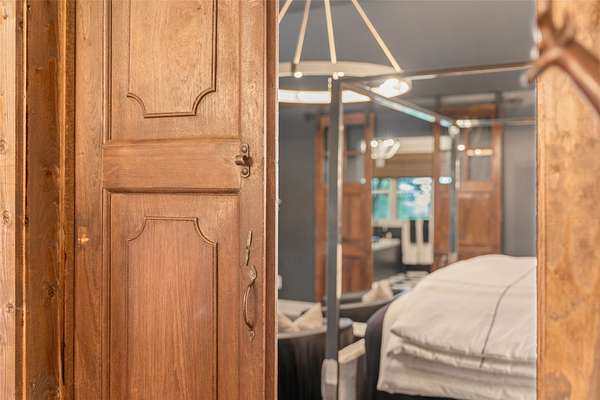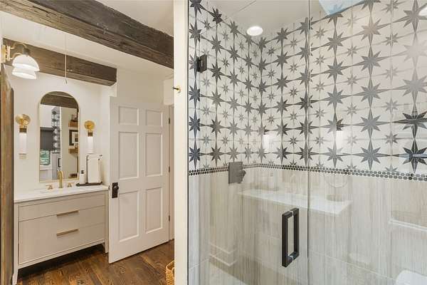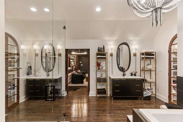 - Beamed Ceilings, Bookcases, Breakfast Bar, Built In Features, Cathedral Ceilings, Ceiling Fans, Chandelier, Double Vanity, Eat In Kitchen, Granite Counters, High Ceilings, High Speed Internet, His And Hers Closets, Jetted Tub, Kitchen Island, Multiple Closets, Open Floorplan, Pantry, Primary Downstairs, Recessed Lighting, Soaking Tub