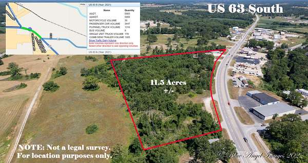 2 parcels - 6 acres and 5.5 acres each with a 40 x 60 metal commercial building. One is fenced in. Established businesses currently occupy both buildings paying monthly rent of $600. each. There is also an uninhabitable house on one of the parcels, do not try to enter, Room for expansion. (PARCELS CAN BE DIVIDED) Billboard income $300. yearly. On a very active area of South US Hwy 63, with 5 approaches from Hwy. 63 Owner will divide on Parcel lines or Splits off the land end with buyer paying for survey! Possible owner terms to qualified buyer!
