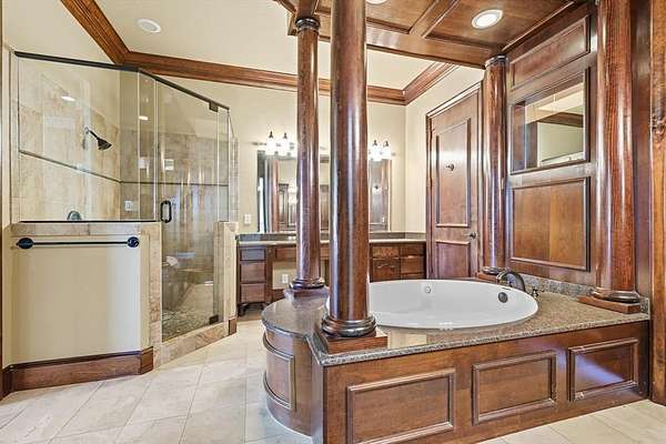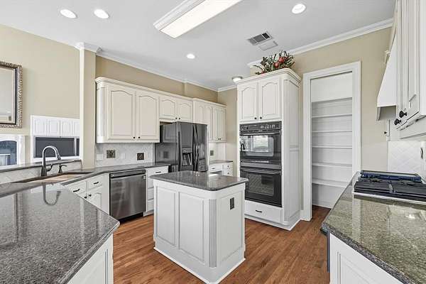 Inside, you'll find elegant crown molding, hardwood floors, and a flowing layout with multiple living and dining areas. The gourmet kitchen features granite counters, double ovens, a gas cooktop, warming drawer, microwave island, and walk-in pantry. The main living room centers around a fireplace with custom built-ins, while the upstairs family room offers a wet bar, private balcony, and pond views. The primary suite on the main level includes a sitting area, fireplace, jetted tub, and walk-in closet. A guest bedroom with private entrance on the main level and an upstairs bedroom with ensuite provides flexibility for family or visitors.