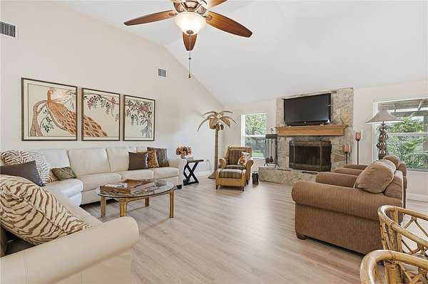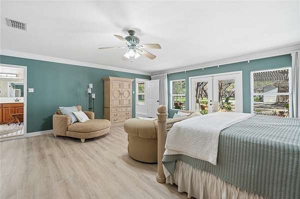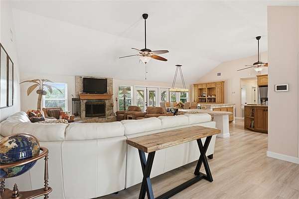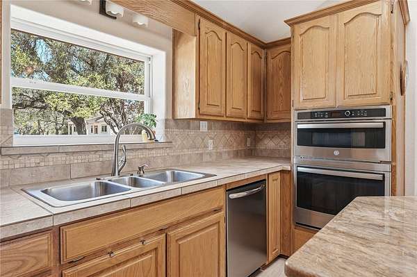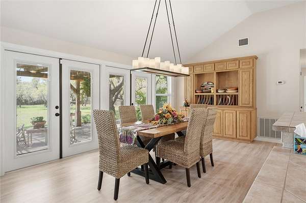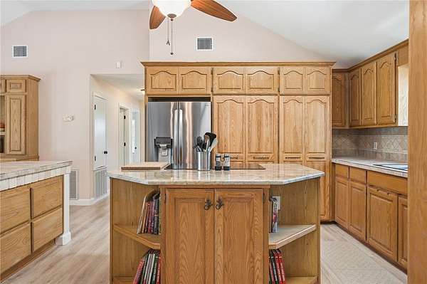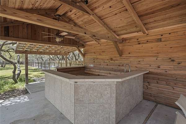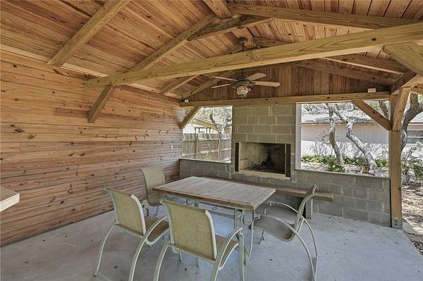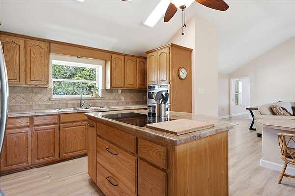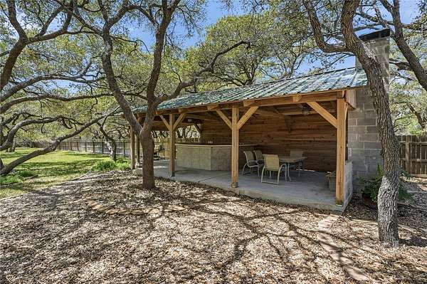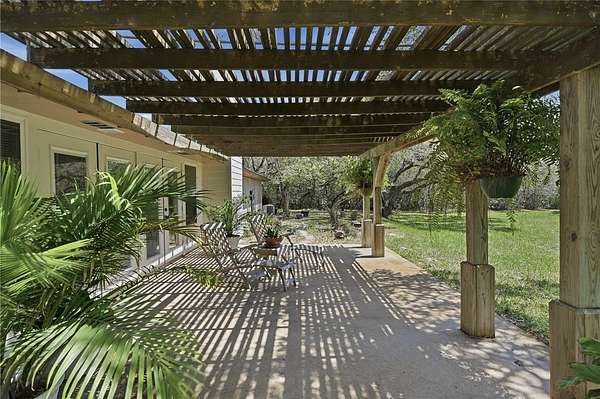 Welcome to "Ms. Clean's House," a beautifully maintained property tucked away off the road on 2 acres shaded by mature oak trees. This serene setting offers privacy, peace, and a true connection to nature. The home features recently replaced windows and an open-concept floor plan with high ceilings, creating a bright and airy feel throughout. The kitchen is a cook's dream, complete with abundant cabinetry and counter space-perfect for entertaining or everyday living. All appliances convey. The spacious primary suite offers a relaxing retreat, while a large dedicated office provides flexibility for work or hobbies. Storage is plentiful throughout the home, making organization effortless. Outdoor living is just as impressive, with multiple sitting areas designed for relaxation and enjoyment. Unwind under the pergola or gather around the outdoor kitchen, which features a large fireplace-ideal for hosting year-round. Additional highlights include a detached two-car garage and an approximately 1,214 sq ft. workshop with two overhead doors for easy access, plus an attached large carport for extra covered parking. There is a water well and irrigation system in place for maintaining the yard. This is a rare opportunity to own a meticulously cared-for property where comfort, functionality, and peaceful surroundings come together beautifully.