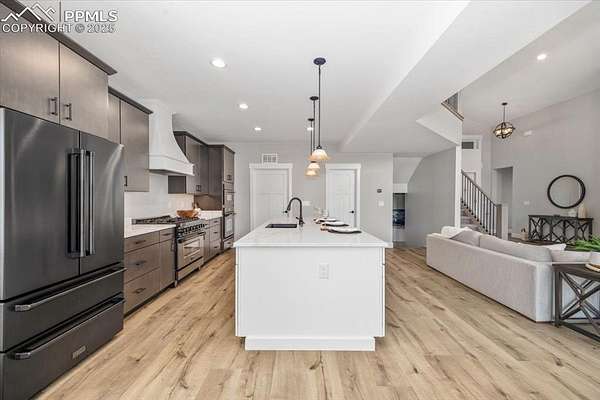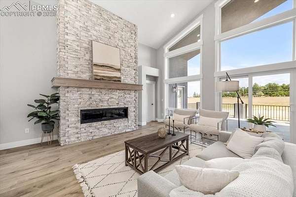 Neighborhood close out - final opportunity!Experience the unmatched serenity and sophistication of this brand-new, never-lived-in custom home, perfectly positioned on a private 2.6-acre lot surrounded by mature trees and natural beauty. As you step inside, you'll be immediately drawn to the breathtaking views and the stunning architectural design throughout. The grand room welcomes you with soaring 23-foot vaulted ceilings adorned with exposed wood beams, a dramatic floor-to-ceiling stone fireplace, and a handcrafted wood mantle that anchors the space with warmth and elegance. Expansive windows bathe the interior in natural light while seamlessly blending indoor and outdoor living. Designed for both everyday living and exceptional entertaining, the chef's dream kitchen features high-end ZLINE Autograph Series appliances-including a 6-burner gas range, double ovens, and a microwave/convection combo-alongside a massive 10-foot quartz island and a walk-in pantry. The main-level primary suite offers a peaceful retreat with direct access to the covered deck. Its spa-like ensuite boasts a zero-entry shower with triple shower heads, a freestanding soaking tub, dual floating vanities with under-cabinet lighting, a bidet, and a generous walk-in closet. Upstairs, the loft overlooks the grand room with beautiful wrought iron railings and offers two additional bedrooms and a full bath-ideal for family or guests. The finished walk-out basement is an entertainer's paradise, complete with a full wet bar, expansive rec and game rooms, and a versatile safe room that doubles as a wine cellar or secure space. Two more large bedrooms, each with en-suite baths, complete the lower level. This is your last chance to own in this exclusive neighborhood-don't miss it! This is our lowest priced spec home available.