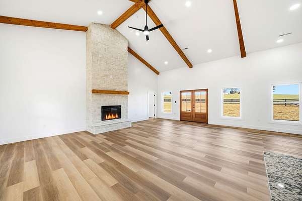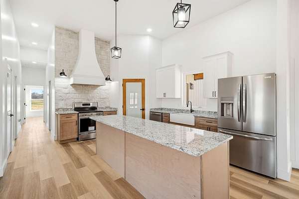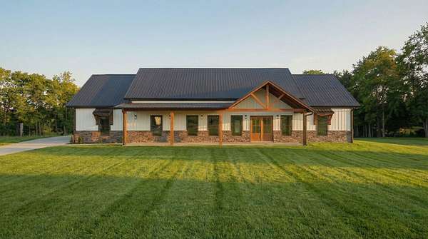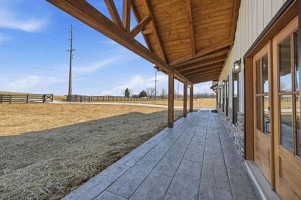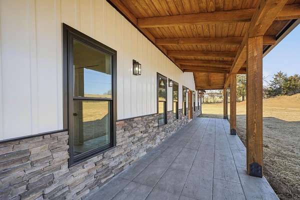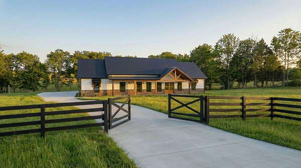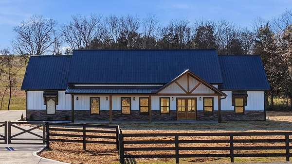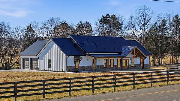 Welcome to this stunning custom barndominium situated on 2.08 acres and offering 2,250 sq ft of beautifully designed living space. This home features 4 bedrooms, 2 bathrooms, plus a dedicated office, and showcases quality craftsmanship and high-end upgrades throughout. The exterior is highlighted by seamless siding, stone accents, upgraded 8x8 cypress beams, tongue and groove ceiling over the porches, and stamped concrete that adds to the homes curb appeal. The front yard is fully fenced and secured with a remote controlled gate, providing both privacy and functionality while enhancing the homes country setting. Inside, you'll find LVP flooring throughout, 10-foot ceilings, and a bright open-concept, split-bedroom floor plan. The living area boasts a vaulted ceiling with custom beams and a striking floor-to-ceiling stone fireplace that serves as the centerpiece of the home. The kitchen is designed for both style and function, featuring granite countertops, an oversized island, custom vent hood with stone surround, and all stainless steel appliances-perfect for entertaining or everyday living. The spacious primary suite offers a relaxing retreat with a custom tile shower, soaking tub, double vanity with LED mirror, and an oversized walk-in closet. All additional bedrooms include large walk-in closets, providing ample storage. You'll also appreciate the large laundry/mudroom conveniently located off the oversized two car garage, adding to the homes practicality. Conveniently located in Talbott, TN, this home is just 3 miles from the interstate and Lakeway Christian Academy, offering the perfect balance of quiet living and easy access to town amenities.
