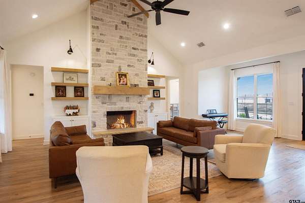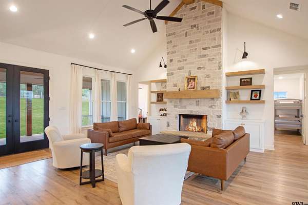 Welcome to this breathtaking home offering 5 bedrooms, 3.5 bathrooms, and a 2-car garage, perfectly situated on 1.68 acres. From the moment you arrive, the grand front elevation and expansive yard create a warm and impressive welcome. Step inside to an open, light-filled layout highlighted by large windows that bathe the home in natural light. The living room is centered around a gorgeous fireplace framed by built-in shelving and cabinetry. The bright, spacious kitchen is a chef's delight with an oversized island, abundant counter space, and extensive storage. One of the bedrooms features a full wall of built-in bookshelves--ideal for a reading nook, home office, or display space. Additional bedrooms are generously sized, with two connected by a stylish Jack-and-Jill bathroom. Each bathroom features beautiful tilework, elegant countertops, and unique fixtures that add character throughout. The mudroom--with built-in bench and cabinets--offers extra storage and flows seamlessly into the large laundry room complete with a sink. The primary suite is its own retreat, showcasing large windows, a soaking tub with a view, a walk-in shower, dual vanities including a dedicated makeup vanity, and a spacious feel throughout. Upstairs, a bonus room provides endless possibilities--media room, game room, or guest suite--and opens to a private balcony with stunning views. Outside, the massive backyard offers endless room for entertaining, relaxation, or future additions--making this property a true dream home inside and out.