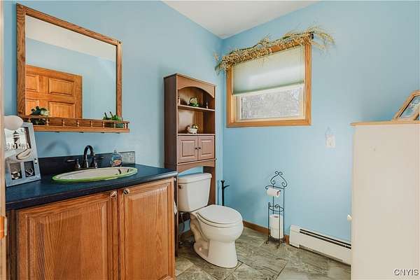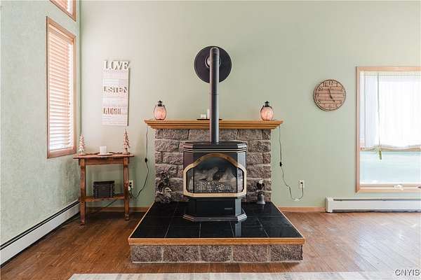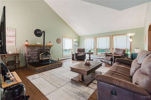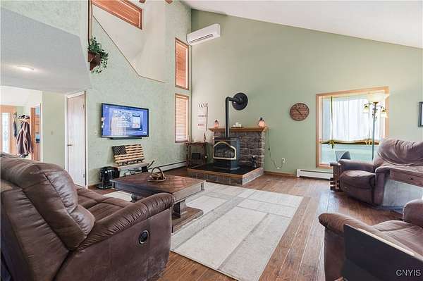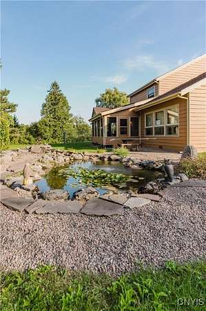 Welcome to 16687 Limerick Heights Drive, a striking contemporary home set on 5.37 acres in Dexter, NY. Offering 1,859 sq. ft. of beautifully finished living space, this property blends modern design with artistic detail and showcases the pride of ownership throughout. From the stylish interiors to the thoughtfully planned outdoor spaces, this home is truly one of a kind. The main floor offers an inviting layout with gorgeous hardwood floors, a bright living room featuring a gas fireplace with stone mantle, and custom blinds on marquee windows. The kitchen includes a large pantry and connects seamlessly to the dining area and enclosed porch. A renovated half bath and convenient first-floor laundry add to the functionality. Upstairs, you'll find 3 bedrooms and 2 full bathrooms, including a spacious primary suite with a beautifully designed en suite bath featuring artistic tilework, mosaic accents, in-floor heating, and a double sink vanity. Carpeting throughout the upstairs was replaced in September 2025. Mechanical systems are strong, with annual HVAC service, a boiler system, gas stove, supplemental mini-split heating and cooling, and a "water buddy" hot water system. The propane tank is owned and can convey with the property-an uncommon advantage offering future fuel savings. Outdoor living is a highlight, with a private deck, paver patio, fire pit, and power hookup for a gazebo or outdoor TV. A year-round fountain and koi pond with a heater add an artistic touch to the landscape, complemented by classy, well-maintained gardens, a solar-powered lighthouse well cover, and walking trails. Two storage sheds and a second gravel driveway offer extra convenience. Recent major improvements include: rebuilt chimney (2024), full exterior repaint (August 2025), roof replacement in the living room (2022), septic pumped and line cleared (2023), and updated propane tank float system (2025). This property offers a perfect blend of artistry, functionality, and natural beauty with wooded privacy surrounding the home. Truly one of a kind-call today to schedule your private showing!