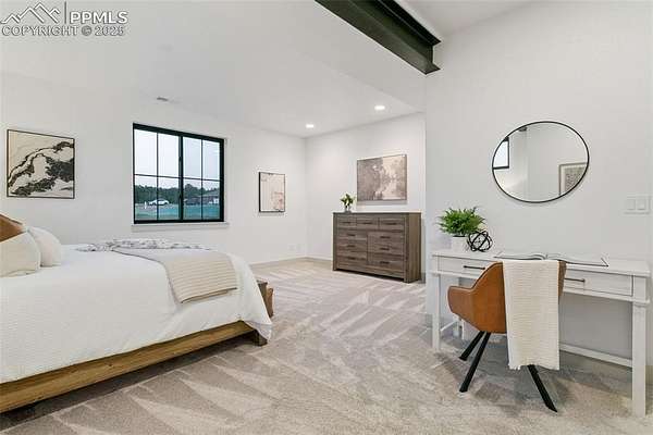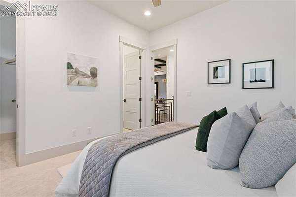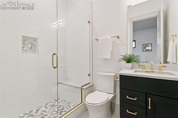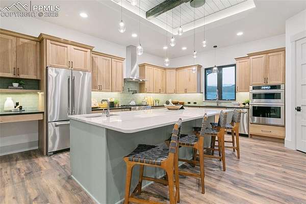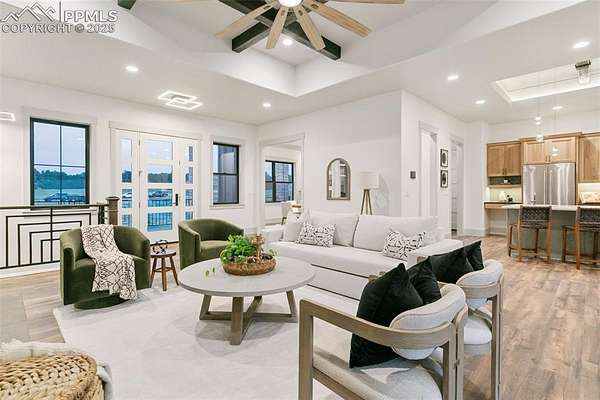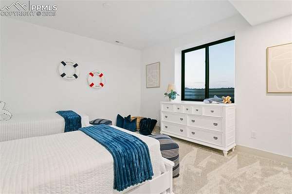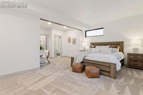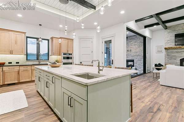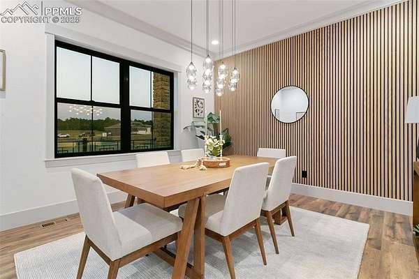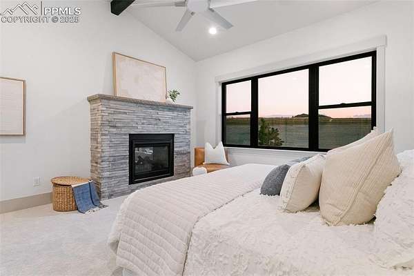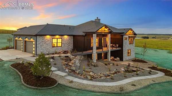 Nestled on a spacious homesite in the picturesque Winsome community, this 2025 Parade Home built by JS Luxury Homes blends refined design, timeless craftsmanship, and modern livability. The stately exterior of stone, wood, and rich architectural detail sets the tone for the luxurious interior within. Expansive windows capture sweeping views of Colorado's landscape, while the soft glow of evening light enhances the home's warm, inviting presence. Inside, every detail is thoughtfully curated. The open-concept great room features soaring ceilings with exposed beams, a stunning stacked-stone fireplace, and wide-plank flooring throughout. Oversized glass doors connect the living space to a covered patio with a double-sided fireplace and stone fire pit, creating the perfect setting for indoor-outdoor living. The chef's kitchen is elegant and functional, highlighted by natural wood cabinetry, a large quartz island, full tile backsplash, and stainless appliances including a gas range and double ovens. Pendant lighting and a built-in workspace make this kitchen the heart of the home. The dining area with wood-slat accent wall offers an intimate setting framed by designer lighting and large picture windows. The primary suite is a true retreat with mountain views, a stone fireplace, and a spa-like bath featuring custom cabinetry, dual vanities, and a glass-enclosed shower. The finished lower level includes a wet bar, rec room, home gym, and guest suites. Outdoors, enjoy year-round living by the covered patio fireplace or fire pit while taking in stunning sunsets.