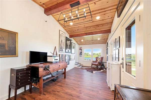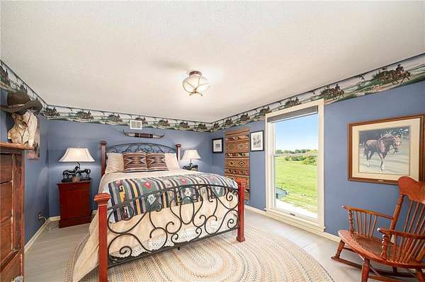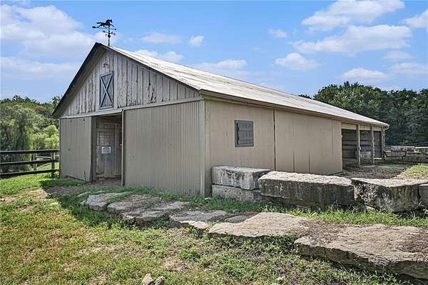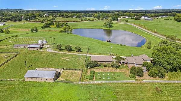 This gated property offers a unique blend of tranquility and modern living, situated on 29 picturesque acres with breathtaking views, including a 6-acre pond. The landscape features rolling hills and a variety of fruit trees, including apple, cherry, plum, pear, and peach. The equestrian enthusiast will appreciate the 7-stall horse barn equipped with electricity, a sheep barn and tractor barn, providing ample space for all your needs. A 4-car detached garage with large doors, perfect for SUVs and trucks, featuring a convenient 1/2 bath and an 8x12 concrete storm shelter for added safety. Enjoy outdoor living with covered patios and walkways leading to the garage, perfect for entertaining or relaxing. The home itself has been completely remodeled, featuring all new wiring and plumbing, a stunning kitchen with custom cabinets, high-end appliances, a butler's pantry area that any chef would adore. The primary bath and closet have also been fully renovated. The home features a newer roof, new HVAC , new windows, combining the charming character of an old farmhouse with the modern conveniences of today. The property is powered by GEOTHERMAL energy ensuring efficiency and sustainability. The pond is complete with a dock & stocked with bass, crappie, perch, and catfish. Experience the best of country living while being conveniently close to amenities and the airport. Don't miss this opportunity to own a slice of paradise!