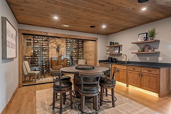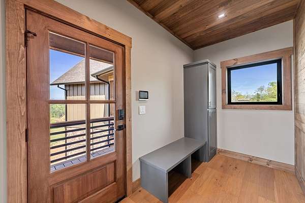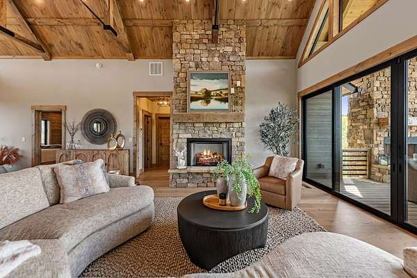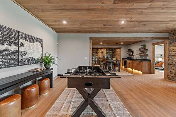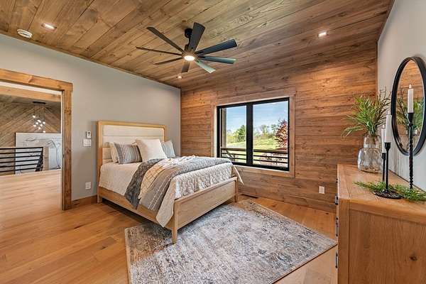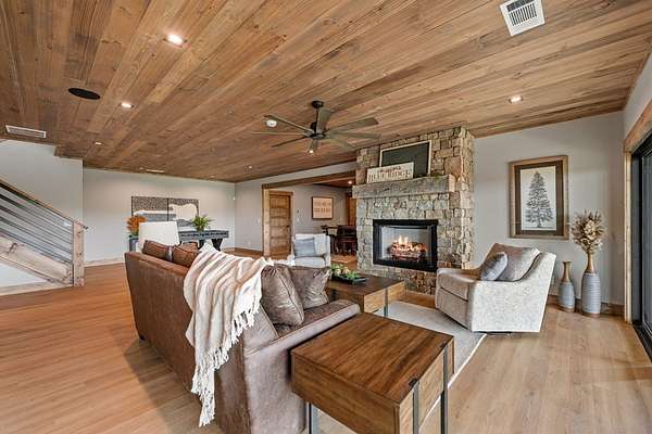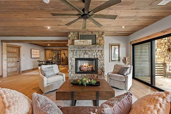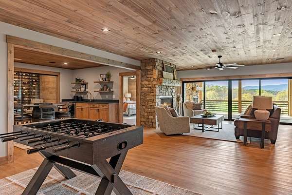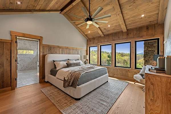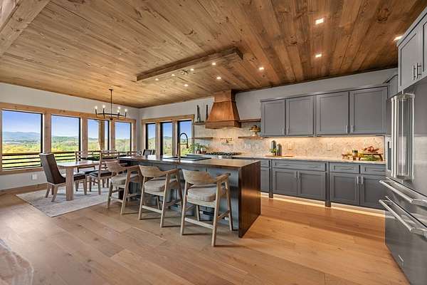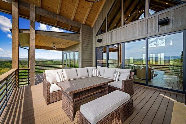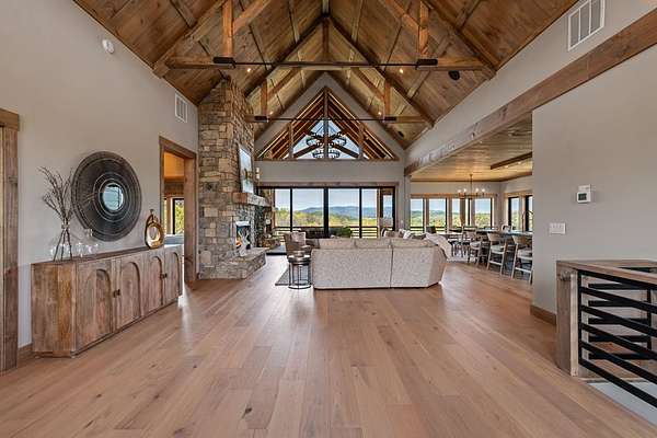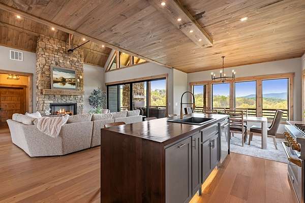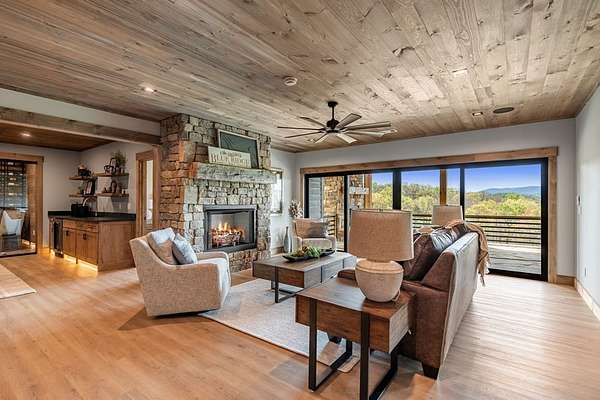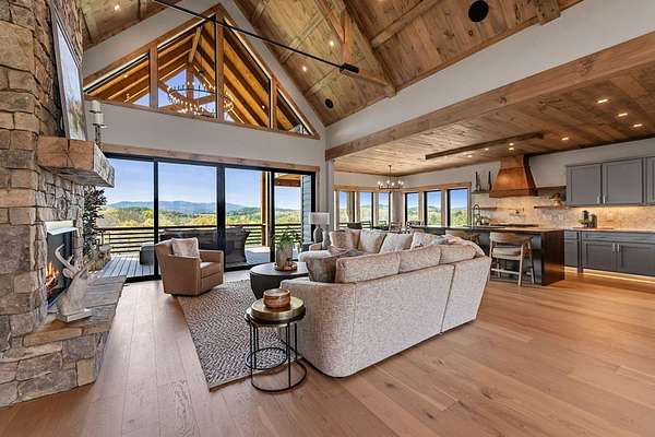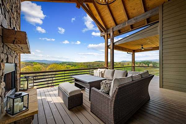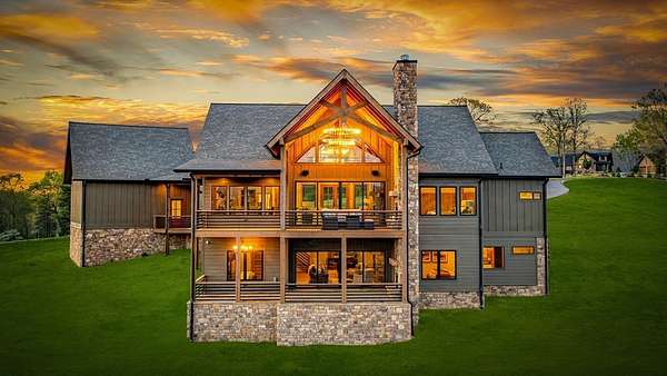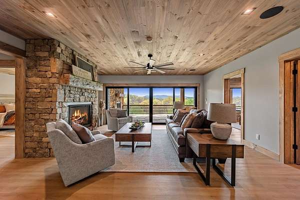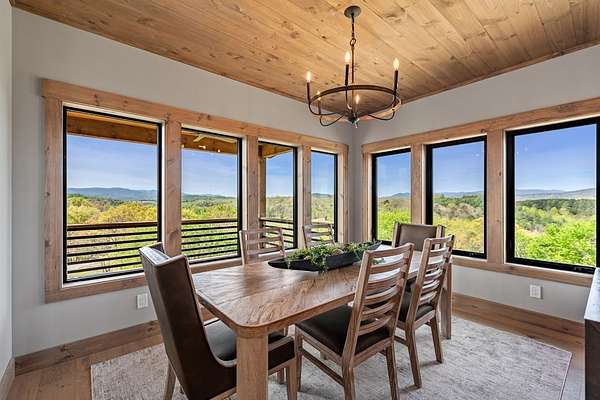 Welcome to this extraordinary mountain sanctuary within the exclusive enclave of Sunset Over Cohuttas! This residence represents a masterful fusion of timeless elegance, sophisticated design, and breathtaking natural surroundings. Located just 2.4 miles from the heart of Downtown Blue Ridge, this exceptional property offers a private retreat for those with discerning taste seeking tranquility, style, and comfort. As you step through the inviting foyer, you are immediately greeted by sweeping, layered mountain views that unfold through expansive windows in the great room—an awe-inspiring vibe that sets the tone for the home's refined atmosphere. The open-concept living area features rich hardwood floors & a beautiful stone fireplace giving a sense of timeless elegance. The gourmet kitchen showcases custom cabinetry, luxurious stone countertops, and an intelligently designed layout. Adjacent, the sophisticated dining space provides an ideal setting for intimate gatherings or larger celebrations. Thoughtful details enhance everyday living, including a well-appointed laundry area on the main level and a spacious mudroom off the two-car garage, ensuring seamless practicality infused with style. The lower level elevates the home's sophistication, offering two additional bedrooms and two full bathrooms. A versatile flex space or office provides an inspiring environment for work or creative pursuits. Wine connoisseurs will appreciate the dedicated climate controlled wine room, thoughtfully designed to house and savor fine vintages. An expansive storage area keeps belongings organized and the home clutter-free, preserving its sleek, elegant aesthetic. Step outside to a highly functional yard—ideal for outdoor entertaining, or peaceful solitude amid nature's serenity. Gated access and paved roads enhance both privacy and convenience, while the landscape's natural beauty is accentuated by spectacular sunset vistas that paint the sky in vibrant hues every evening.