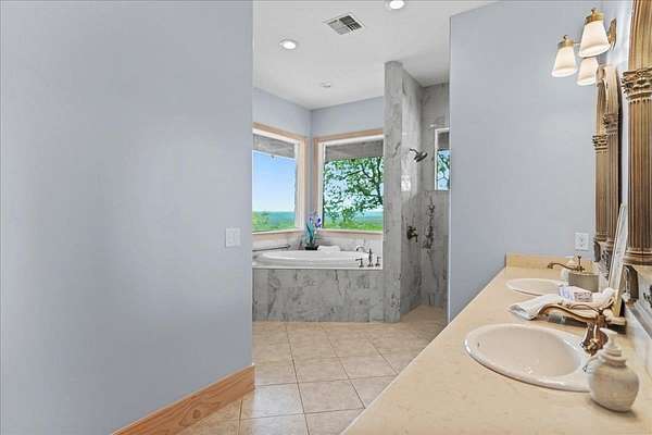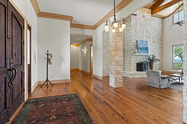 - Beamed Ceilings, Bookcases, Breakfast Bar, Built-In Features, Ceiling Fan(s), Crown Molding, Double Vanity, Entrance Foyer, Granite Counters, High Ceilings, Kitchen Island, Multiple Living Areas, Open Floorplan, Pantry, Primary Bedroom On Main, Recessed Lighting, Soaking Tub, Walk-In Closet(s)