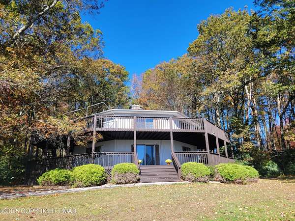 Est $2,715/moDiscover architectural brilliance in this custom-built 4-bedroom, 3-bath octagonal masterpiece, nestled on just over 3 acres in The Highlands with sweeping year-round views of Blue Mountain. No Dues!! Designed for seamless indoor-outdoor living, this home features two levels of wraparound decking accessible from every corner, vaulted ceilings, skylights, and a stunning floor-to-ceiling stone fireplace with a soapstone wood stove anchoring the great room. With a spacious layout that includes a private master suite, guest quarters, hot tub room, and a laundry chute for added convenience, this home is as functional as it is unforgettable-truly a rare gem in the Pleasant Valley School District.