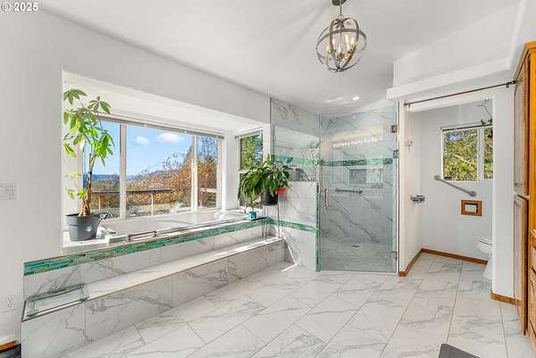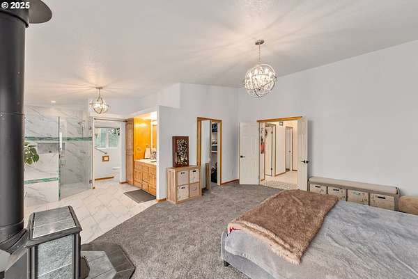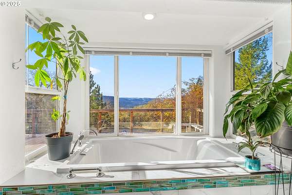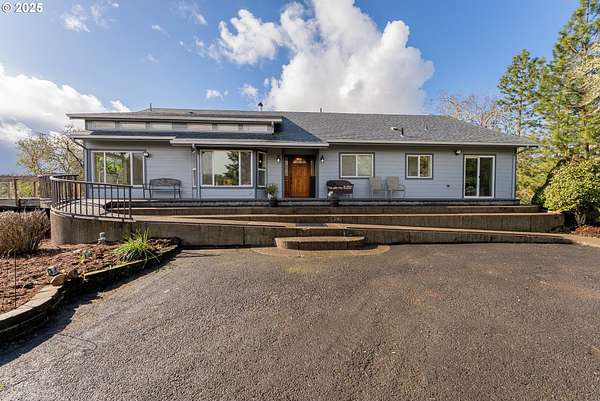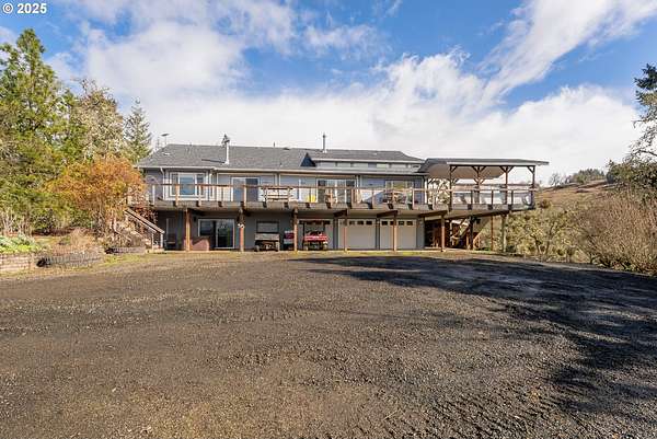 Roseburg City Water has now been added to the property! It is hooked up and ready to use. This 81-acre property is split between grazing/farmland and forest. The 4-bedroom, three-bathroom house with over 4000 sq ft was built in 1993 and sits on a hilltop with expansive views. 1000 sq ft of decks wrap around the house. The kitchen includes granite counters, island, and a walk-in pantry with a wet bar in the living room. Flooring is a mix of tile, new LVP and carpet. The upper floor has 3 bedrooms, 2 bathrooms and the laundry room with outside access. The primary bedroom features a walk-in closet, shower, and soaking tub with 2 sinks and a toilet. The ground floor has a separate apartment with a kitchen, living room, bedroom and a full bathroom with a jetted tub, sauna, and steam shower. In addition to the apartment on this level is a 3-car garage and a bonus room with a pellet stove. The properties water comes from a spring with water storage that is treated with UV filtration, a water softener, and regular filters. City water is available, but lines would need to be repaired. A 4000 sq foot agricultural building has 2 possibly 3 stalls, a half bathroom, indoor hay storage, and a climate-controlled tack area. Don't forget the 3 miles of trails for side by sides or horses.