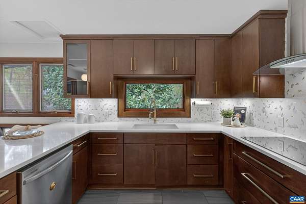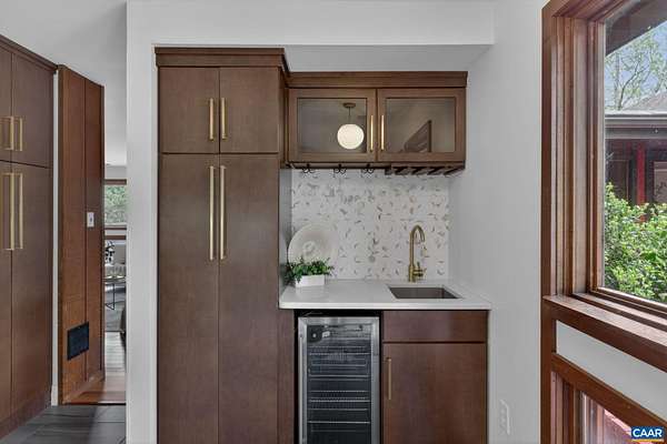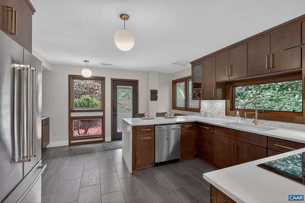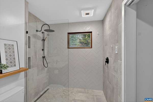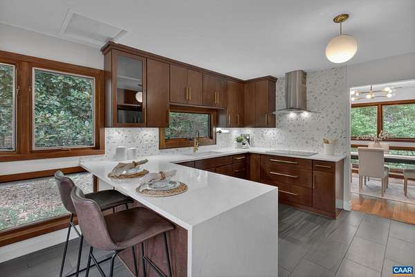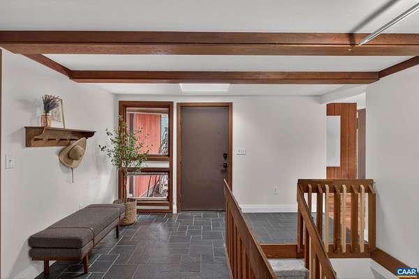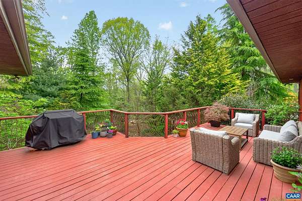 OPEN HOUSE SUNDAY NOON - 2PM. You won't want to miss this mid-century inspired gem! So close to town, yet it lives like a sanctuary. Large, well-placed windows and the newly installed, functional and fabulous bi-fold door open to the back deck for a seamless connection to nature—you will want to spend all your time here. The updated kitchen features quartz counters, a wet bar with beverage fridge, double oven, and electric cooktop. The layout works beautifully, with modern entertaining spaces in the front wing and quieter sleeping spaces in the back. The bedroom wing includes a new heat pump with programmable thermostat. The workspace—its own separate wing (not pictured)—offers an oversized garage, two additional rooms for crafts or office use, and a recently installed Level 2 EV charger. The walkout basement features a wood-burning stove, improved handrail system, new carpet, a new mini-split, and an Energy Star washer and dryer. Located in the Stone Robinson Elementary and Monticello High School districts.