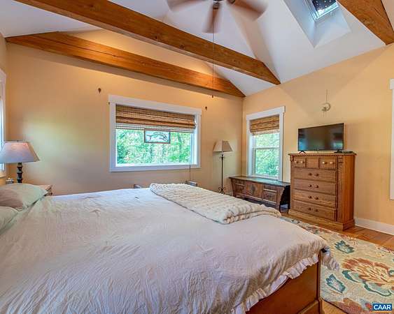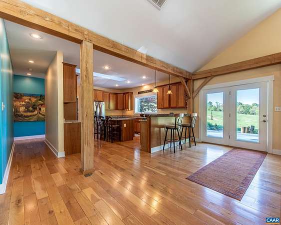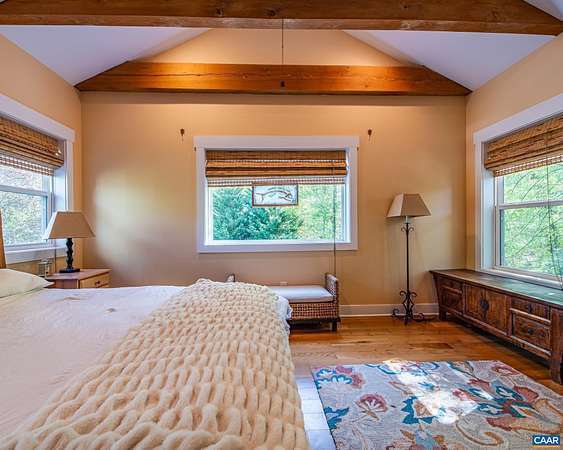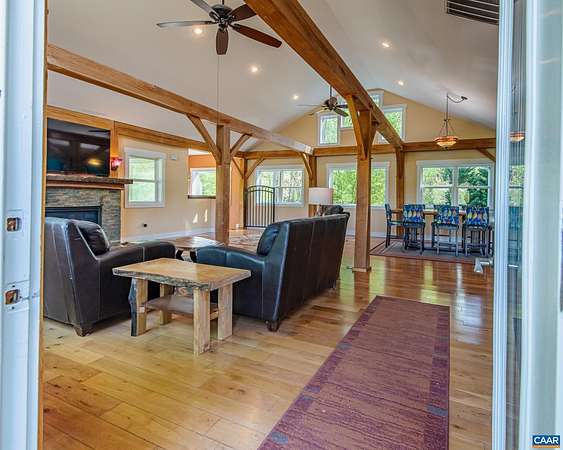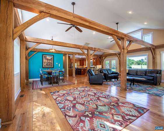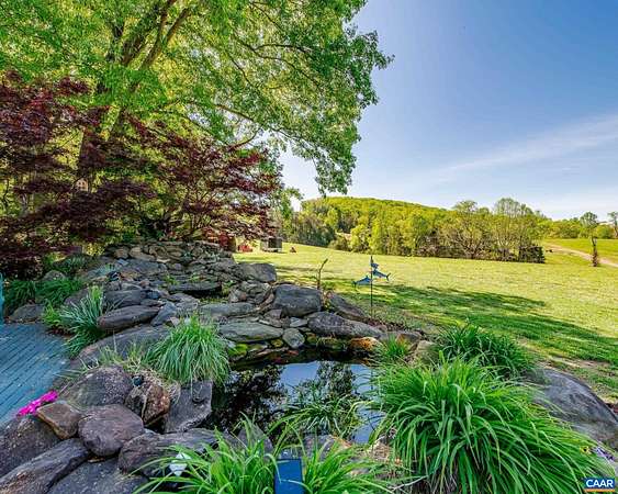 Set on over 20 private acres just minutes from Charlottesville and Wegmans, this exceptional property offers breathtaking mountain views and a rare combination of craftsmanship, comfort, and convenience. The main residence, built in 2015, features over 3,000 finished sf with 3 bedrooms and 2½ baths. This stunning white oak timber frame home was thoughtfully designed and custom-built with beams hand-selected by the owner, who brings over 45 years of experience in the timber industry. The home offers true one-level living with an open floor plan, soaring ceilings, abundant natural light, and beautiful oak flooring throughout. A striking cherry bar and custom gas fireplace mantel—crafted from a tree sourced directly from the property—create a warm and inviting focal point. The spacious kitchen features quality cabinetry by Cabinets by Design. Outdoor living is equally impressive, with expansive deck space overlooking nearly level land, a koi pond, a spring-fed duck pond, and a firepit—all framed by sweeping mountain views. Additional improvements include a barn (approximately 52’ x 16’), an outbuilding with a separate electric meter, and a charming guest house w/full bath, loft and private deck. Convenient access to Rt 29 and I-64