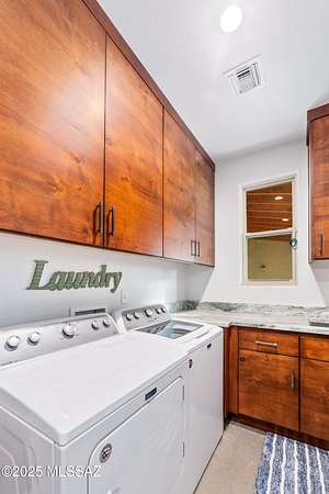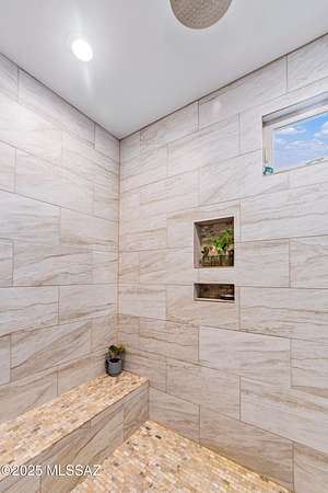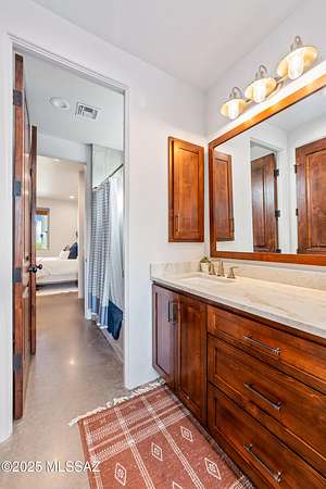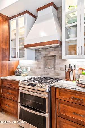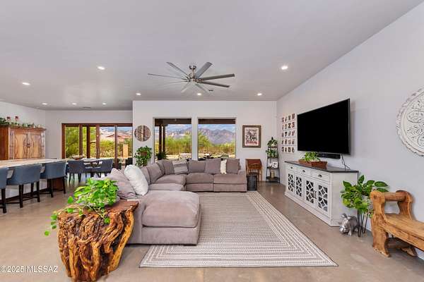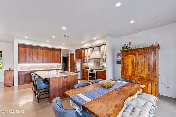 Interior features include a Gourmet kitchen with handcrafted knotty alder cabinets and sleek leathered granite countertops, expansive kitchen island perfect for gatherings and meal prep, high-end stainless-steel appliances, and a large walk-in pantry. Open-living spaces filled with floor to ceiling views of Pusch Ridge and remarkable natural light. Spacious bedrooms with ample storage, a modified jack and jill bathroom with separate vanity areas for each guest bedroom. Flawlessly designed alder cabinetry and doors throughout that elevate both form and function. The mindfully fashioned Primary bedroom includes his and hers walk-in closets, a luxurious bathroom with oversized shower, his and hers vanities, and a separate built-in safe room.