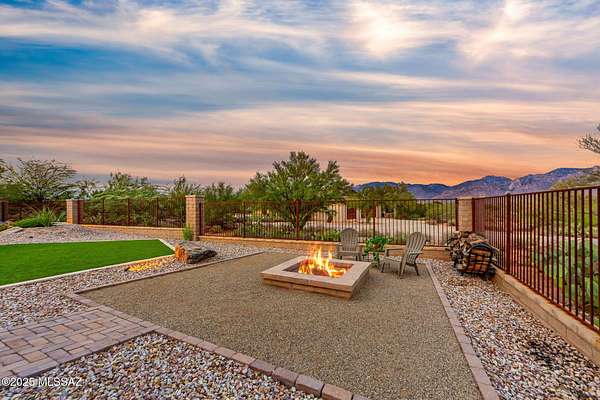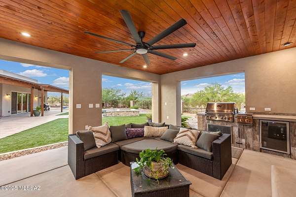 Ideally situated for its unparallel mountain views and optimizing shade in the desert sun, is a sparkling pool and spa perfect for relaxing or hosting memorable gatherings. Timeless travertine decking and eco-friendly artificial turf add a touch of class to this already inviting yard. The recently completed 660' pool/entertainment house seamlessly connects indoor comfort with outdoor leisure, ideal for unwinding in style. Enclosed bathroom equipped with a refreshing shower, WC, and elegant vanity for ultimate convenience. It's open-concept design is complete with a built-in gas BBQ, solid concrete countertops with ample space to pull up to the bar for effortless outdoor dining, a warm and cozy, wood burning fireplace with a 70" TV mounted above, which creates the perfect hub for game days or movie nights under the stars. This addition is fully insulated and has its own water heater, 2 burner gas stovetop, and can possibly be converted into livable guest quarters.