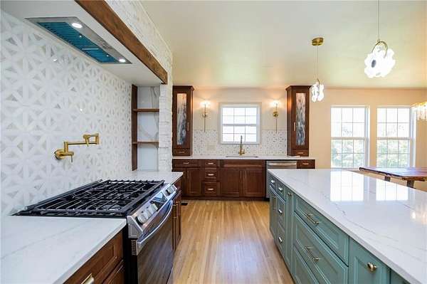 Beautiful secluded 6-bedroom, 3.5-bath home on 5 acres, perfect for privacy and scenic living. Recently refurbished with a modern touch, featuring a new kitchen with quartz countertops, new cabinets, and appliances. The home boasts wood floors and tile throughout, two primary suites on the main level, one with gas log fireplaces, and a versatile bedroom that can serve as a study or family room. The large butler's pantry offers ample storage. Enjoy cozy evenings by the wood-burning stove or the gas fire places. The spacious front porch invites relaxation, while the fresh paint, new hardware, vaulted wood ceiling, and new fixtures add a touch of elegance. The property includes a 27x27 shop with a 12-foot door and cement floors, and a 3-bay loafing shed that doubles as a 3-car carport. A tranquil oasis perfect for extended livingor a private retreat. Schedule your showing today!