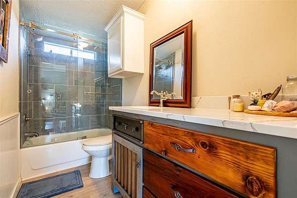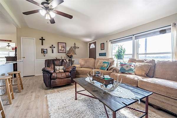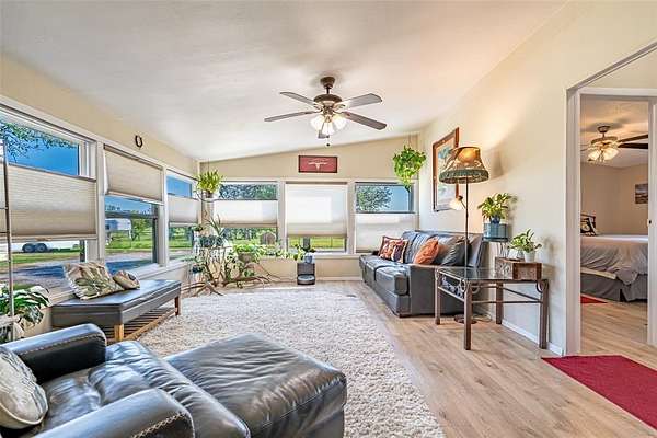 Welcome to your dream retreat--12 serene acres of Texas countryside, thoughtfully designed for comfort, function, and beauty. As you arrive, you're greeted by a soaring covered front porch, framed by stone-accented flower beds and the gentle sway of mature shade trees. Step inside, and natural light pours through new windows with custom magnetic shades, illuminating the beautifully remodeled interior.