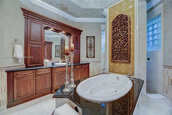 - Bar, Built in Features, Central Vacuum, Closet Cabinetry, Fireplace, First Floor Entry, Garden Tub Roman Tub, High Ceilings, Main Level Primary, Sitting Area in Primary, Split Bedrooms, Walk in Closets, Wet Bar