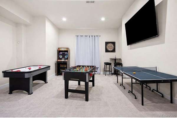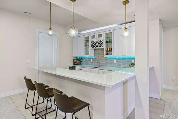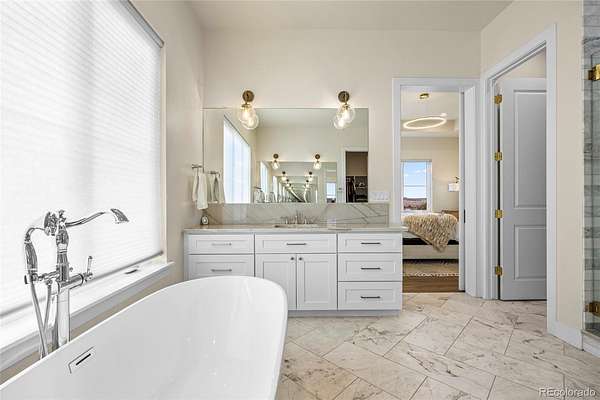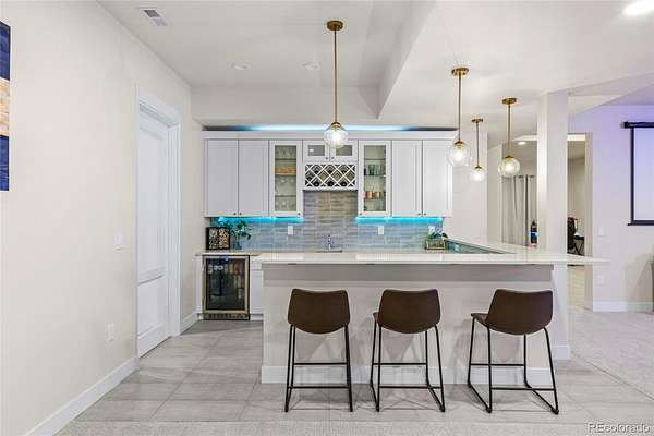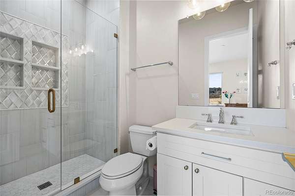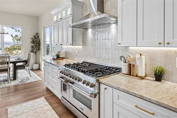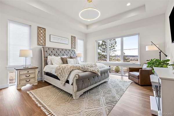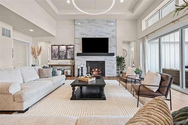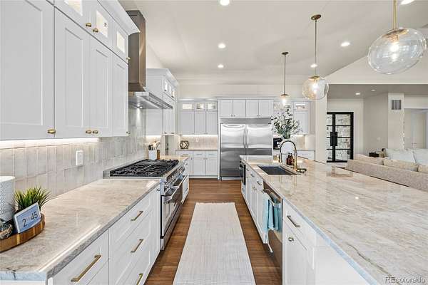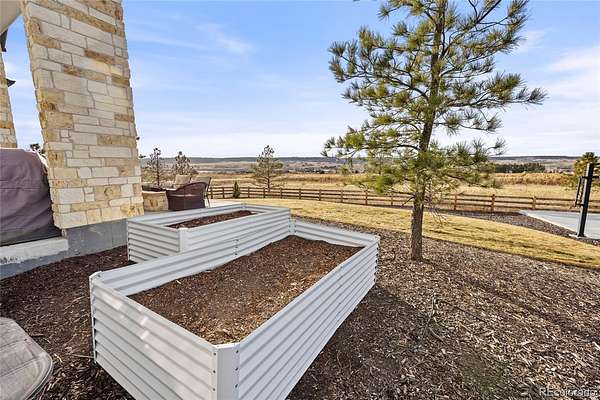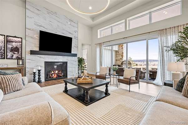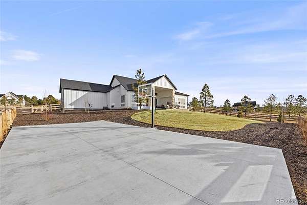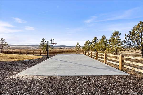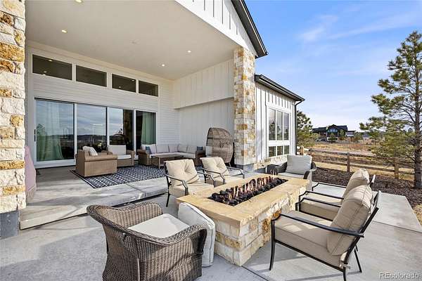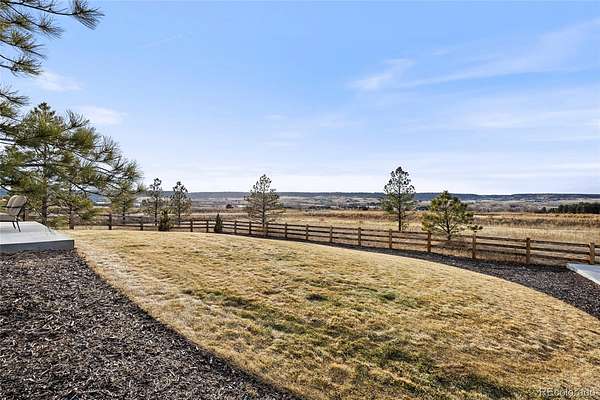 Welcome home to modern luxury, thoughtful design, and elevated living in the gated community of Arrowpoint Estates. Set on a breathtaking 2-acre lot backing to over 40 acres of dedicated open space, this exquisite ranch plan offers unmatched privacy, sweeping mountain and Castlewood Canyon views, and a seamless connection to nature. Soaring ceilings and expansive windows fill the home with warm natural light, highlighting exceptional craftsmanship and open living spaces, anchored by a grand roaring gas fireplace. The gourmet chef’s kitchen impresses with a statement island, 60” built-in refrigerator, premium 6-burner gas range, stacked custom cabinetry with elegant upper glass-front displays, stunning Taj Mahal quartzite countertops, and a gigantic walk-in pantry for exceptional storage. Owners entry features built-in storage and a convenient drop zone. The main-level primary suite is a tranquil retreat with a nice sized bedroom dripping in natural light and incredible views, a spa inspired five-piece en-suite bathroom with dreamy walk-in shower with rain showerhead, and two walk-in closets which connect to the well appointed laundry room. An additional en-suite bedroom with walk in closet and dedicated spacious home office complete the main level. The finished basement is the fun zone boasting soaring 10’ ceilings, stylish wet bar, expansive recreation areas, three additional bedrooms, and two full bathrooms — ideal for guests or easy multigenerational living. Oversized 4 car garage- fits a truck! Immerse in the outdoor living options with picturesque mountain backdrop and the professionally designed landscaping- tons of native pine trees, permanent exterior holiday lighting with smartphone controls, flat lawn space, raised garden boxes, and a custom sport court for basketball or pickleball, creating a private resort-style backyard. Warm ambiance, functional layout, and attention to detail, this home offers more than a residence — it’s a new found lifestyle!