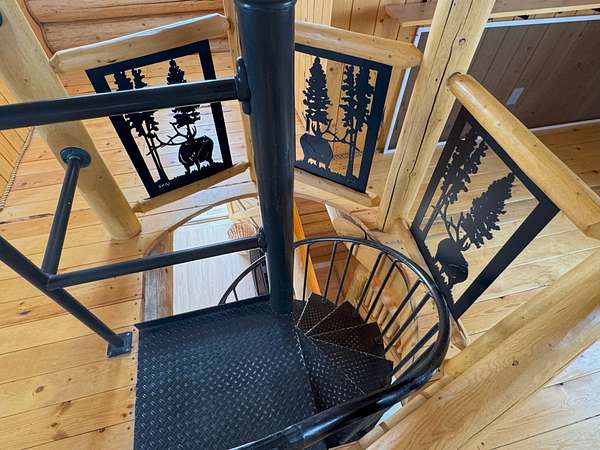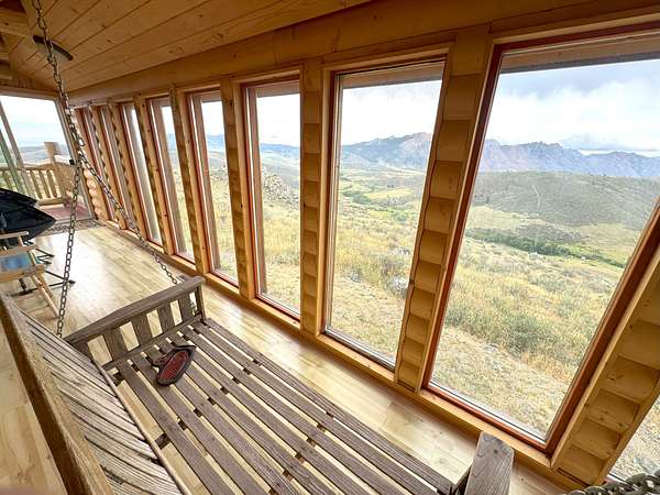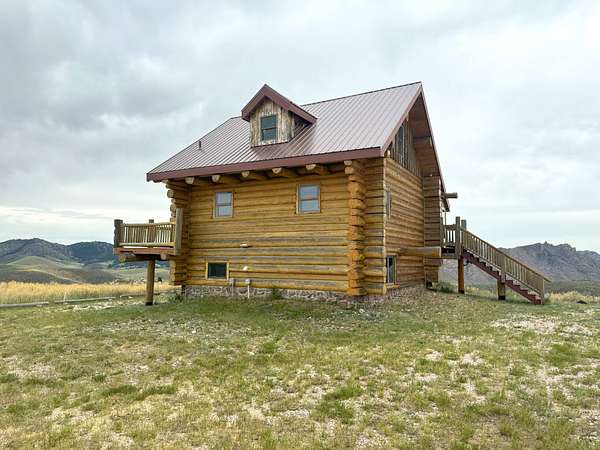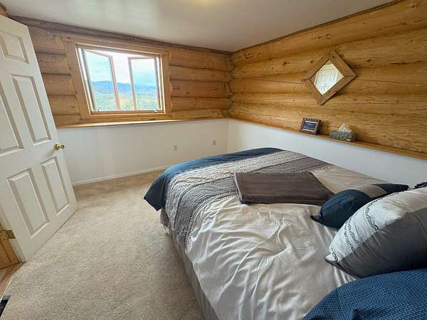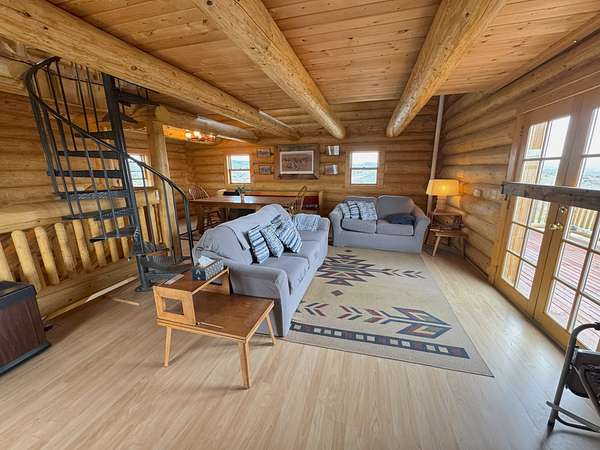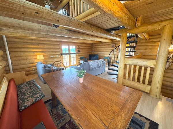 Constructed in 1993, this well built 1,616-square-foot log cabin exudes rustic charm and modern comfort. The one-bedroom, one-bath layout places the kitchen, bedroom, and bathroom on the main floor, while the second floor features an open-concept living and dining area. Unique architectural details elevate the cabin's appeal, including a striking spiral staircase leading to a cozy loft, and a sunroom lined with expansive windows that frame breathtaking mountain views. The spacious outdoor porch is ideal for savoring morning coffee, hosting evening gatherings, or simply soaking in the peaceful surroundings.