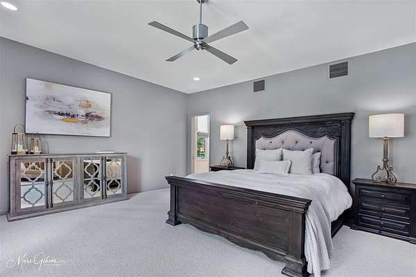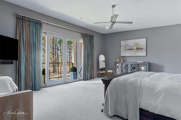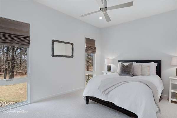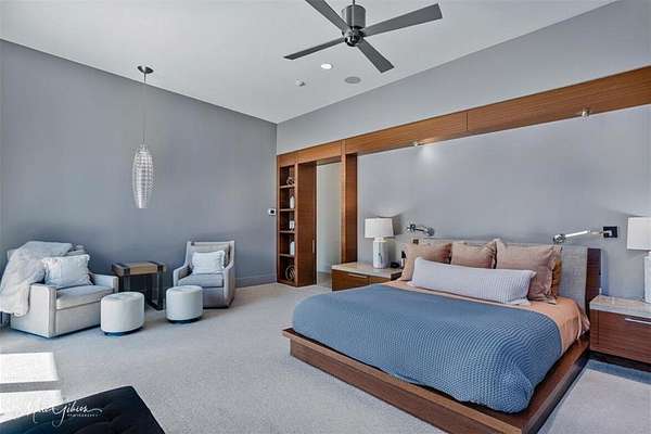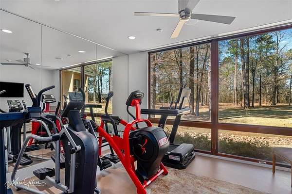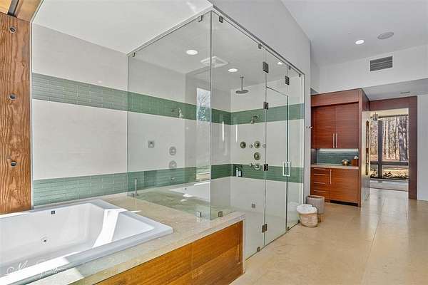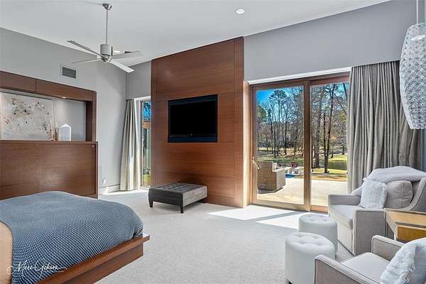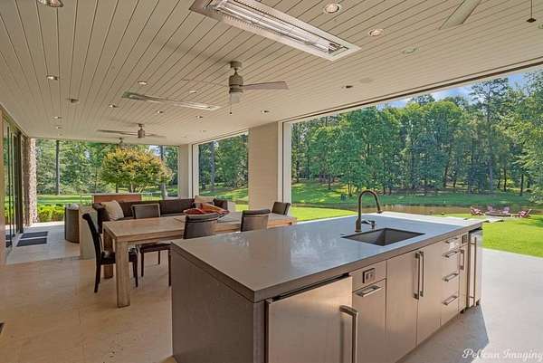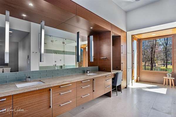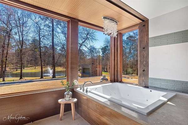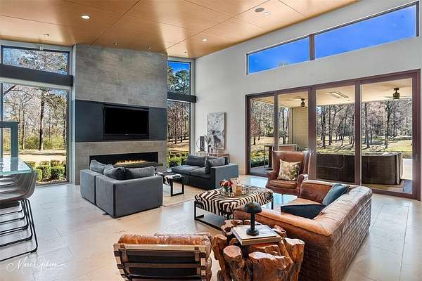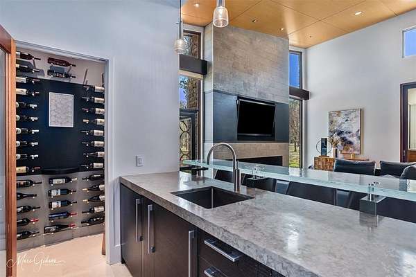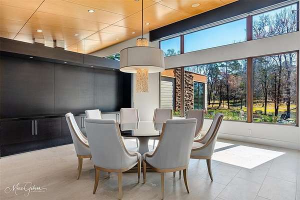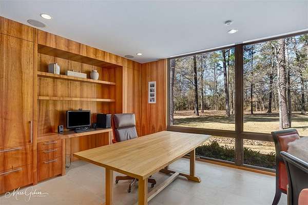 A rare offering—this extraordinary contemporary estate sits on 12 breathtaking acres just beyond the city limits, delivering unmatched privacy, architectural distinction and refined modern living. Surrounded by sweeping natural beauty and tranquil water views, the property offers a remarkable retreat while remaining conveniently close to town. A dramatic cypress and steel entry canopy frames the custom mahogany front door, setting the tone for the home’s striking architectural design. Inside, expansive living spaces are defined by soaring ceilings clad in rift-cut white oak and anchored by a site-built linear fireplace with a Basaltina hearth, creating a warm yet sophisticated atmosphere in the Living Room. The Chef’s Kitchen is both beautiful and functional, thoughtfully appointed with double islands, prep sink, two Bosch dishwashers, a Miele built-in coffee system, a double Wolf range and additional oven. Seamless indoor-outdoor living unfolds as the main living areas open to a stunning Outdoor Living Area complete with a fully equipped outdoor kitchen, ceiling heaters and electric screens, allowing the space to be enjoyed year-round. The private Master Suite is a true sanctuary, offering a dedicated Office, Fitness Room and a spa-inspired Bath overlooking the peaceful pond and pool. The stocked pond provides exceptional fishing and recreation just steps from the home. Designed for both luxury and practicality, the property features private well water, septic system, a whole-house generator and the added benefit of no city taxes. Smart home features include an ELAN sound system, Storm Room and extensive system upgrades completed in 2020. Outdoor amenities further elevate the property with a heated pool and cover, irrigation system and fencing for privacy. The land attracts abundant wildlife, with deer and even bald eagles known to visit. A truly exceptional estate offering privacy, modern innovation and connection to nature—an unparalleled lifestyle opportunity.