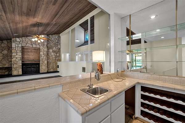 - Built-In Features, Cable TV Available, Cathedral Ceiling(s), Eat-In Kitchen, Kitchen Island, Natural Woodwork, Tile Counters, Walk-In Closet(s), Wet Bar