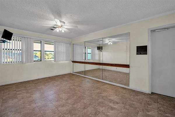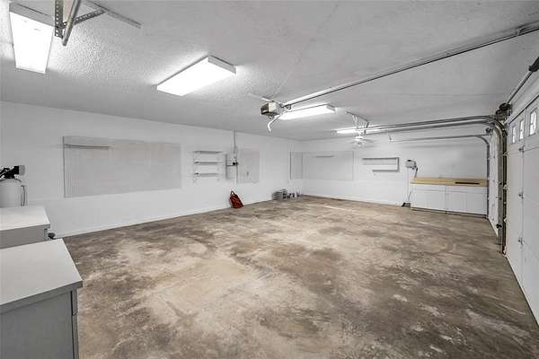 Inside are three spacious bedrooms, two large bathrooms, two expansive living areas, and two dining areas, plus a flexible workout or studio space with a ballet barre. The kitchen includes a built-in island, extensive counter space, and ample cabinetry. A laundry-mud room and attached three-car garage add functionality.